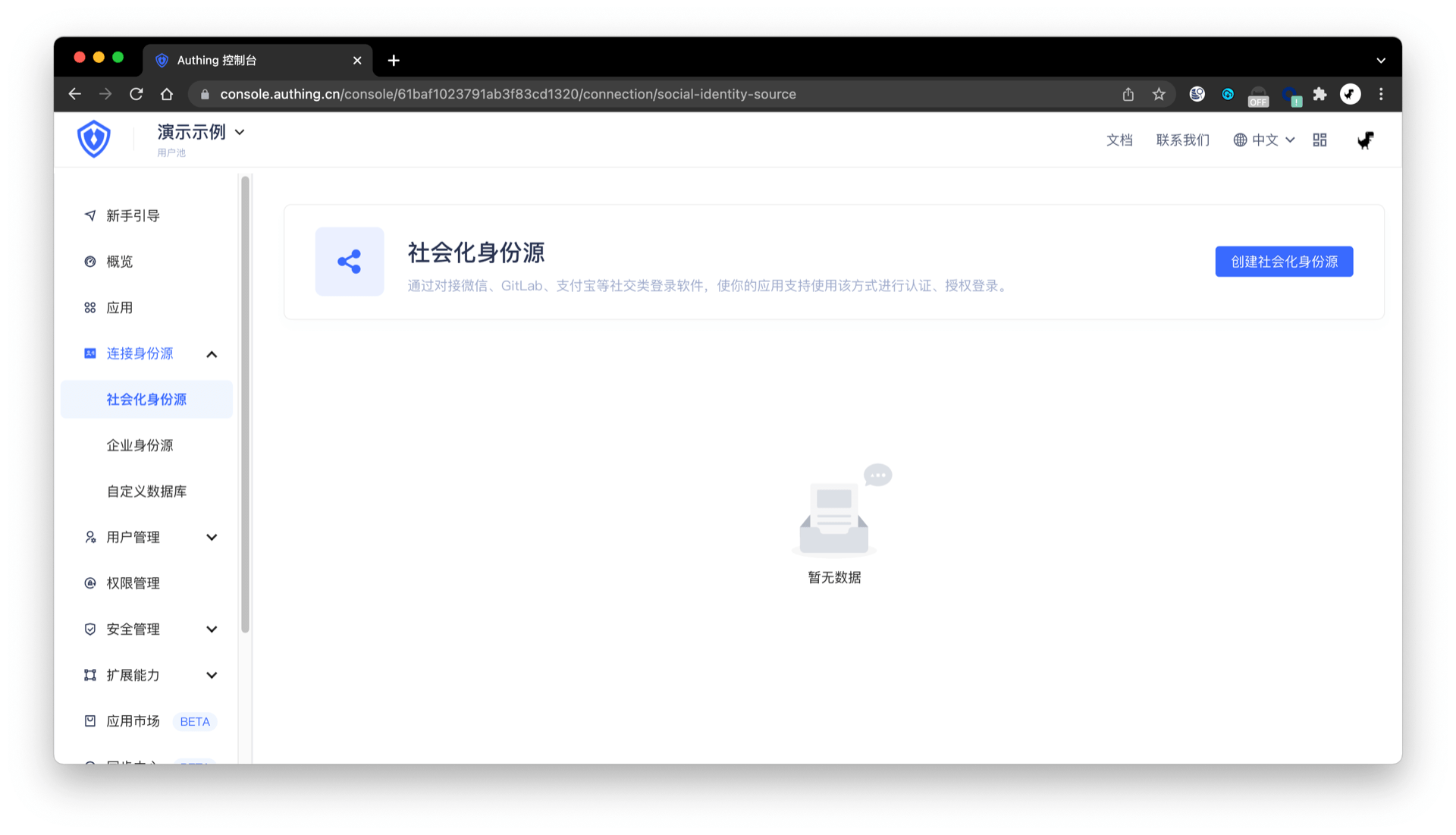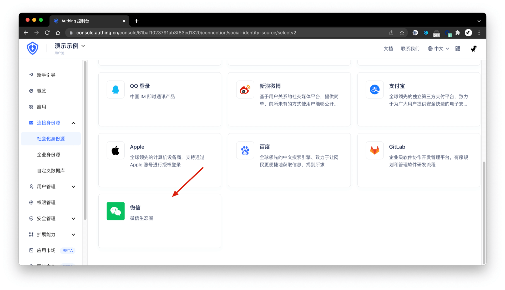 最后在 Authing 控制台 连接身份源 -> 社会化登录 创建一个微信社会化身份源: