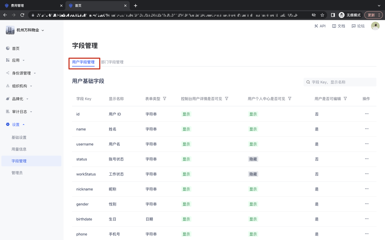 用户字段管理分为用户基础字段和用户扩展字段,可以根据用户字段的使用场景,比如控制台用户详情、用户个人中心进行相应的配置;