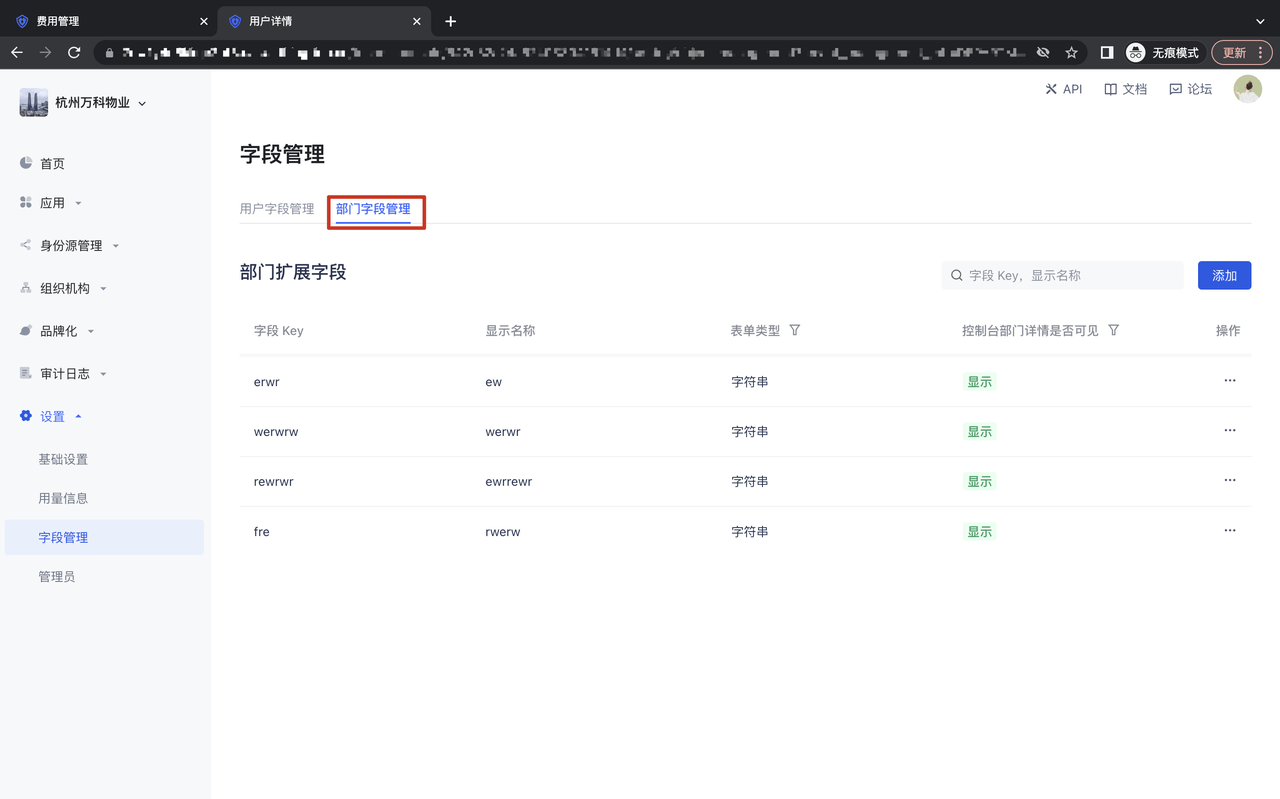 部门字段管理只支持添加扩展字段,添加后的扩展字段支持展示在控制台的部门详情页面;
