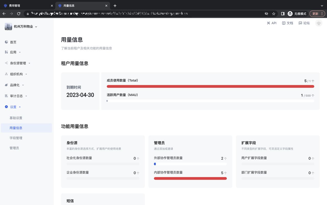 在租户控制台-设置-用量信息下,可以看到该租户的权益及相关的用量信息;