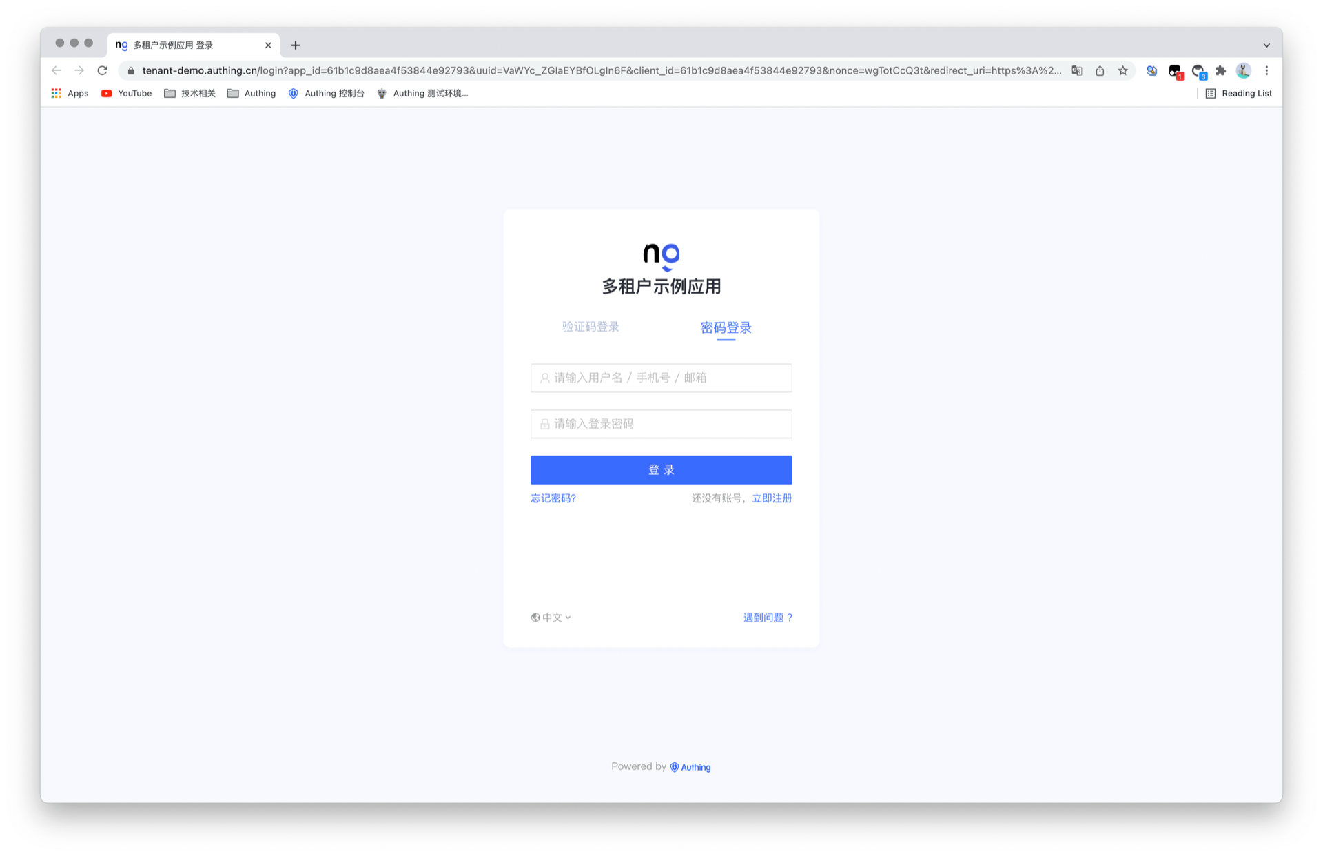 你可以使用以下账号和密码在 Authing 官网 (opens new window) 登录具备多租户功能的控制台,登录后可以看到我们已经在应用中集成好了 Uthing。