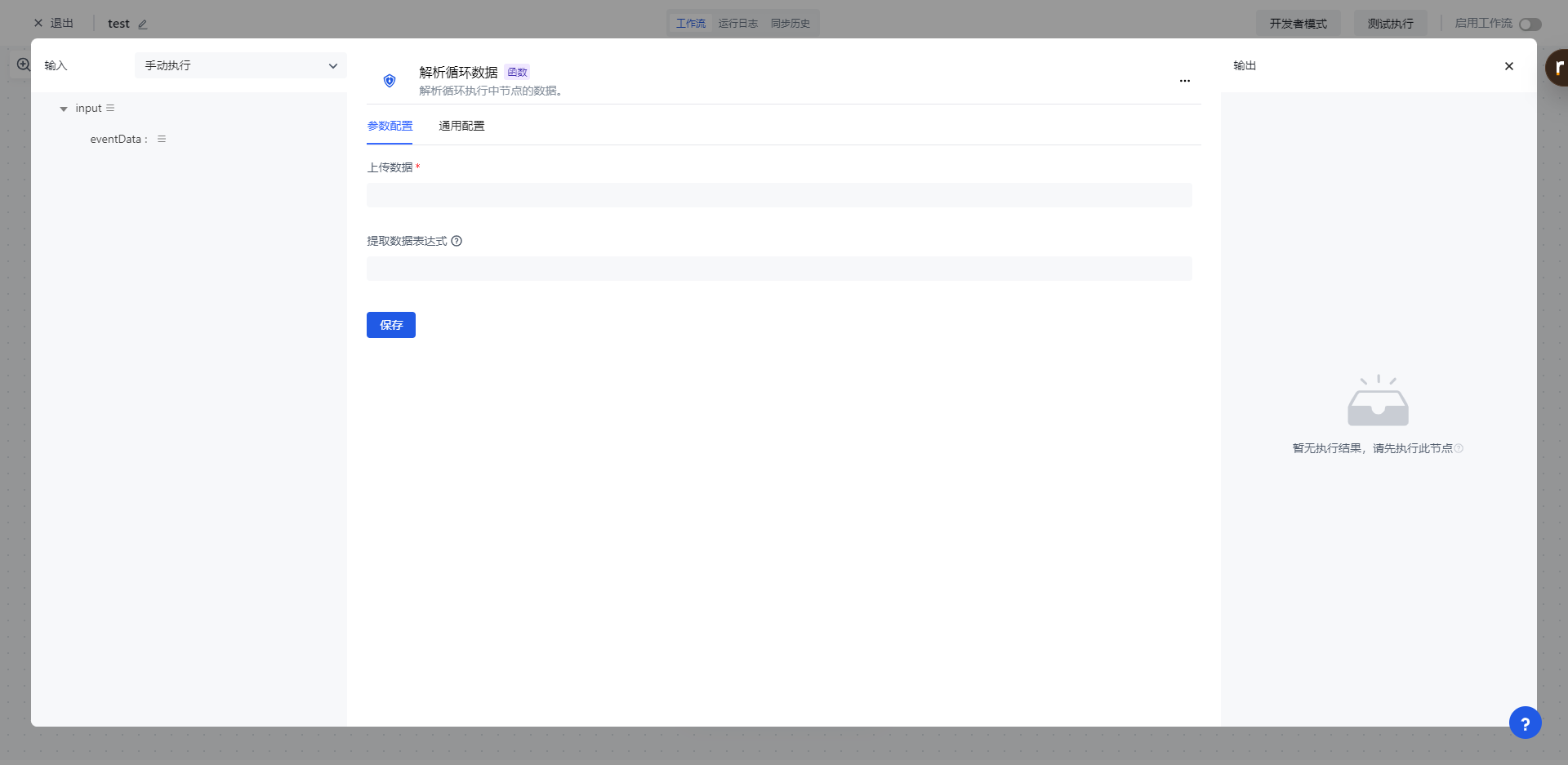 「解析循环数据」节点主要用于解析循环数据,根据自定义数据表达式将数据抽出来。