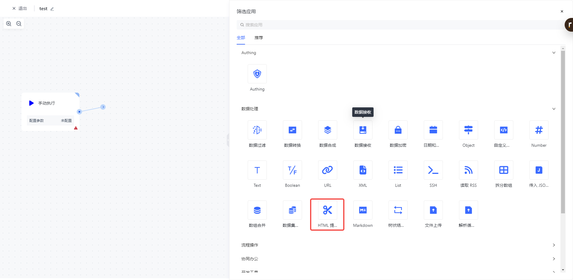 在添加节点页面,在「数据处理」分类中找到「HTML 提取」应用节点。