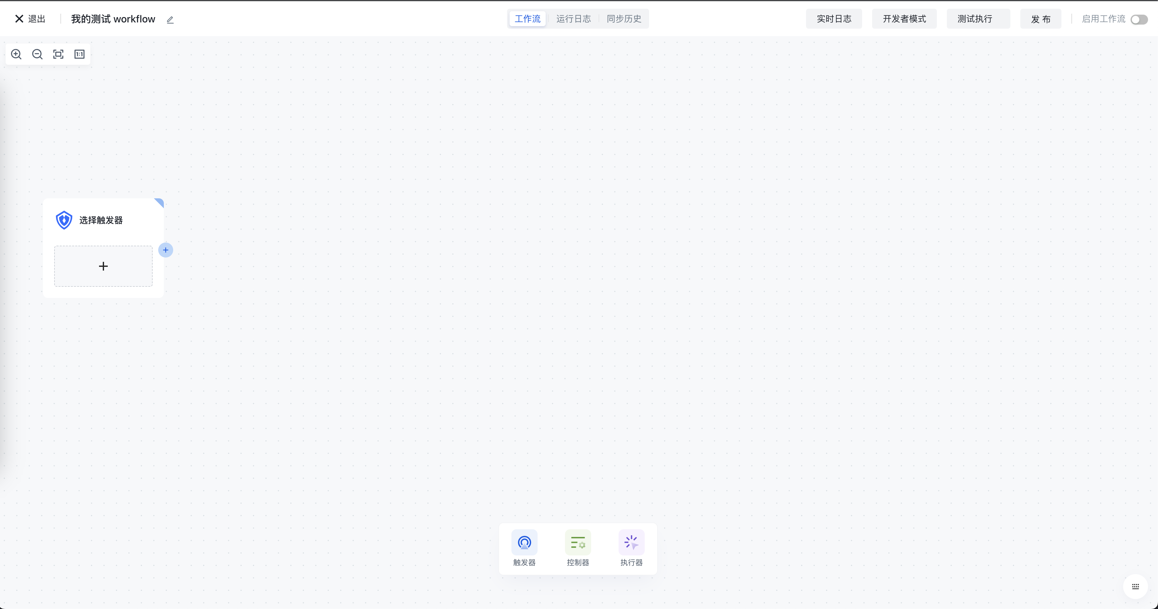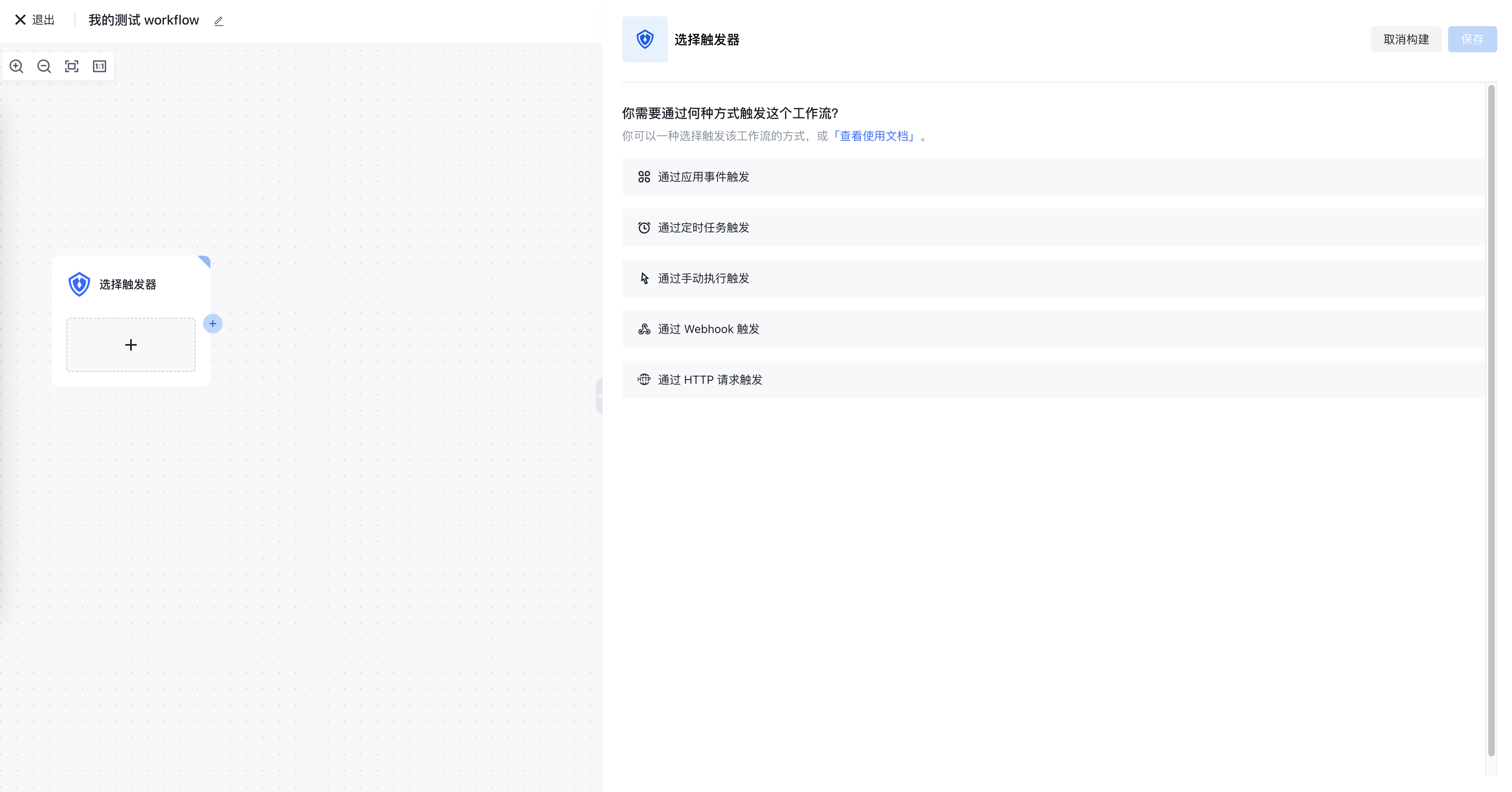 当你创建一个新的 workflow 时,画布上会出现一个空白的触发器,你需要决定你的 workflow 的具体出发方式: