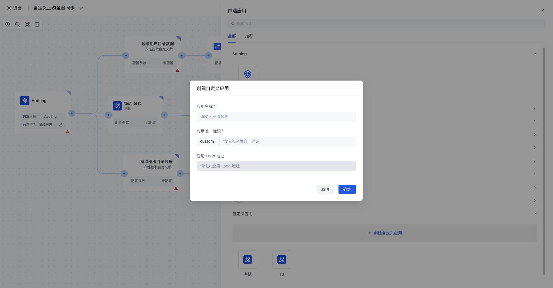 - 在创建自定义应用弹窗中,输入自定义「应用名称」和应用唯一标识「应用编码」,以及「应用 Logod」(非必填)。