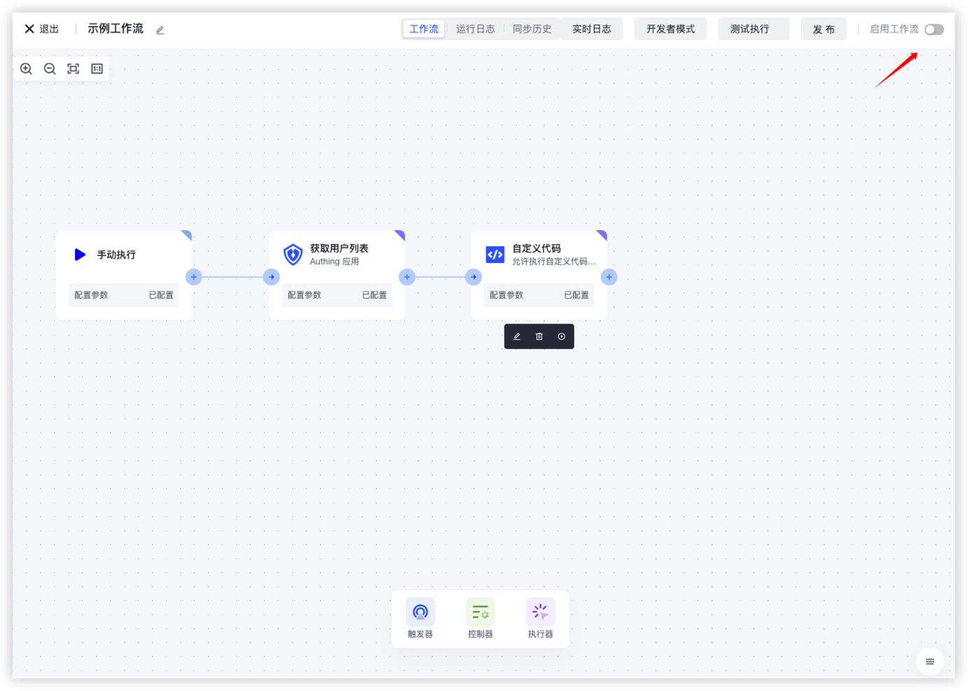 在通过任意方式执行 workflow 之前,你需要首先激活 workflow,否则你配置的任何触发方式都将不会真正生效。