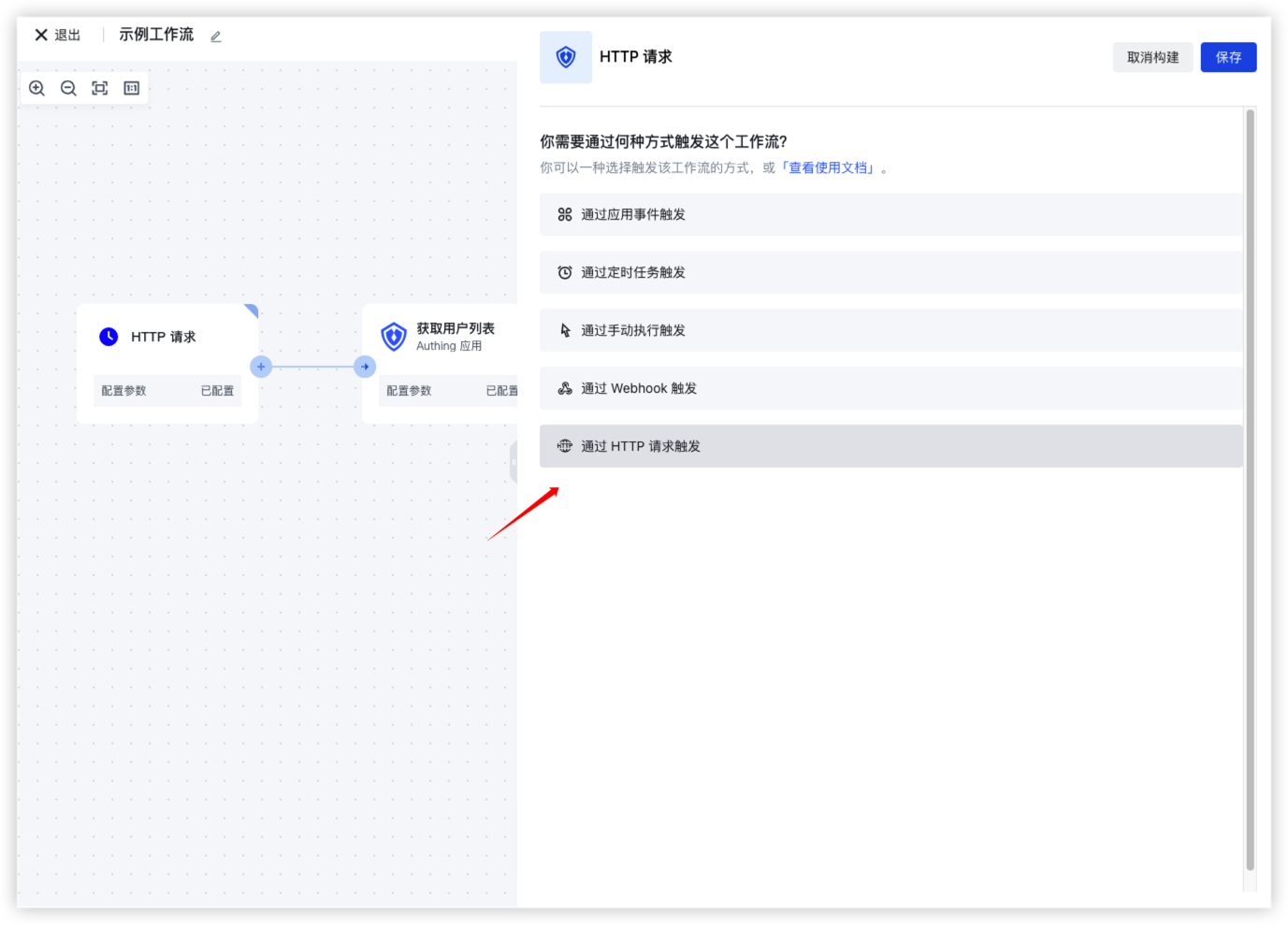 在选择触发器时,选择「通过 HTTP 请求触发」方式: