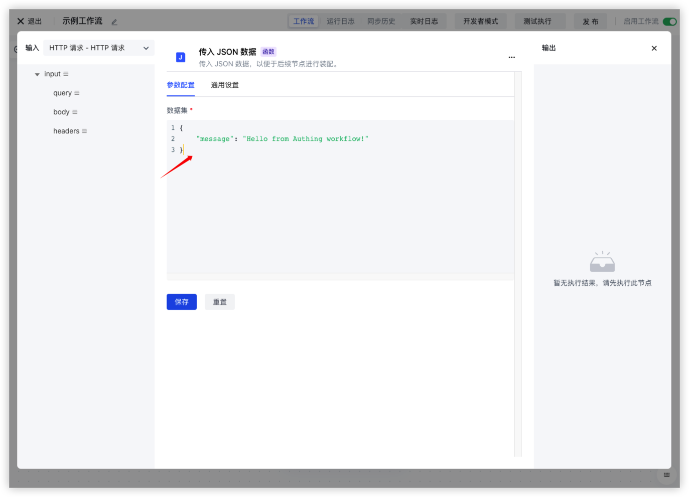 这里我们采用默认配置:使用 GET 请求、不加任何鉴权方式,等待 workflow 执行完成之后返回。在 workflow 中添加一个 JSON 节点,用来返回测试数据: