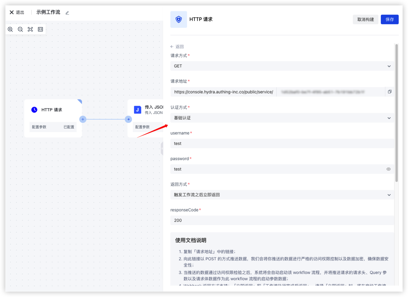 在上一个示例的基础上,我们设置认证方式为「基础认证」,将 Basic 认证用户名和密码设置为 test 和 test。
