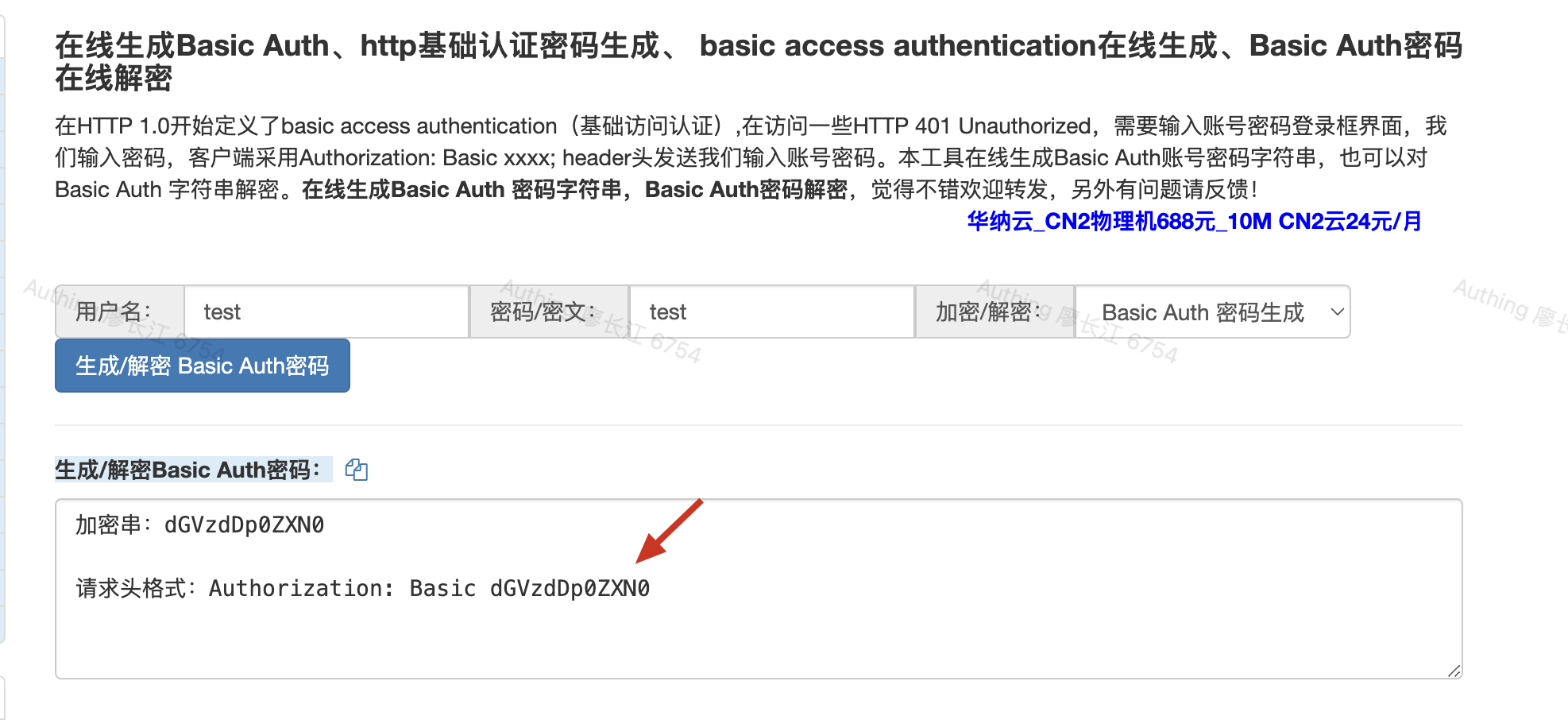 为了测试方便,这里我们使用 http://web.chacuo.net/safebasicauth (opens new window) 此网站来生成 Basic 请求头值: