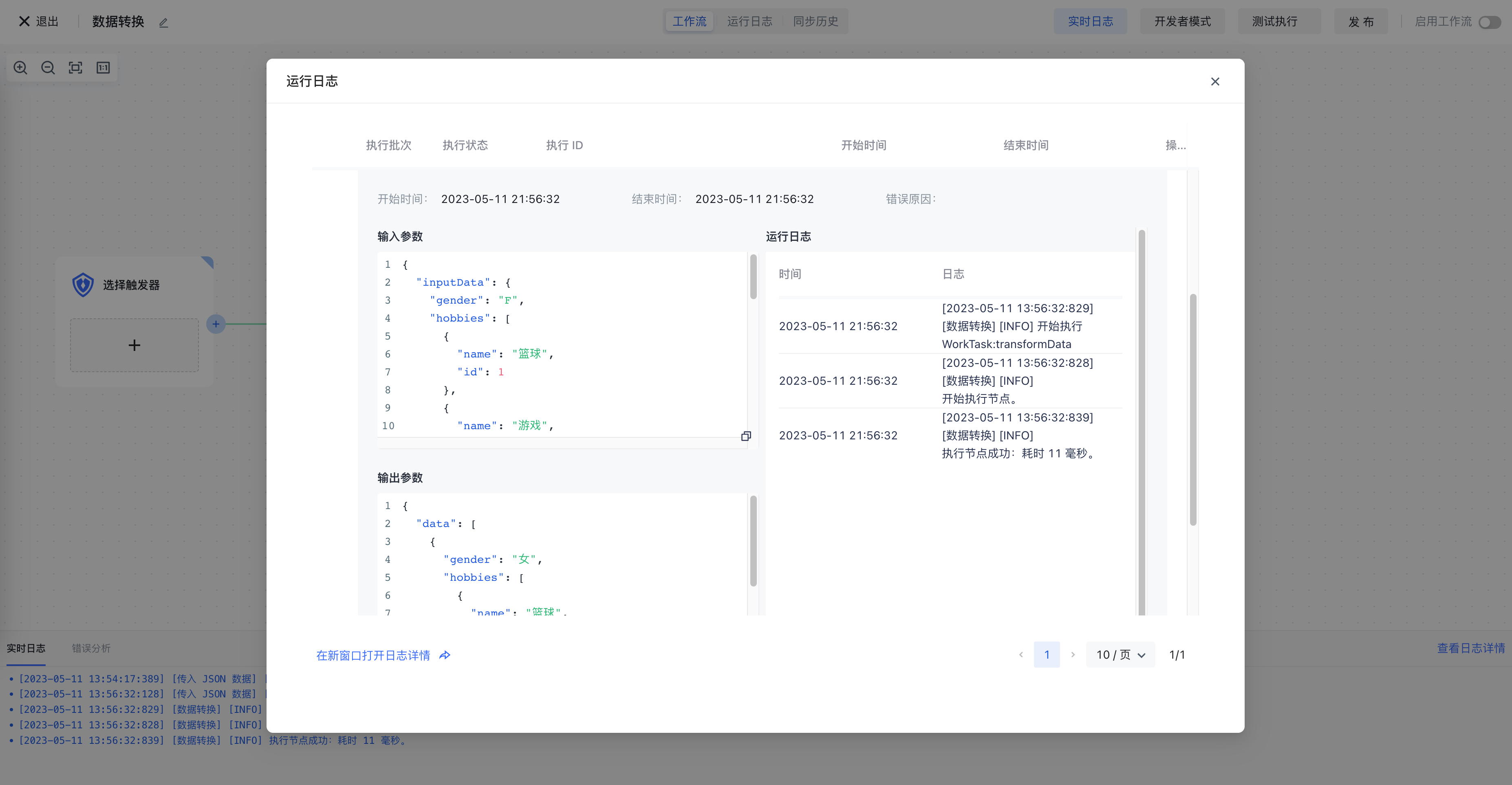1. 点击「立即执行」,等待工作流执行完成之后就可以在运行日志中看到数据转换的结果。
