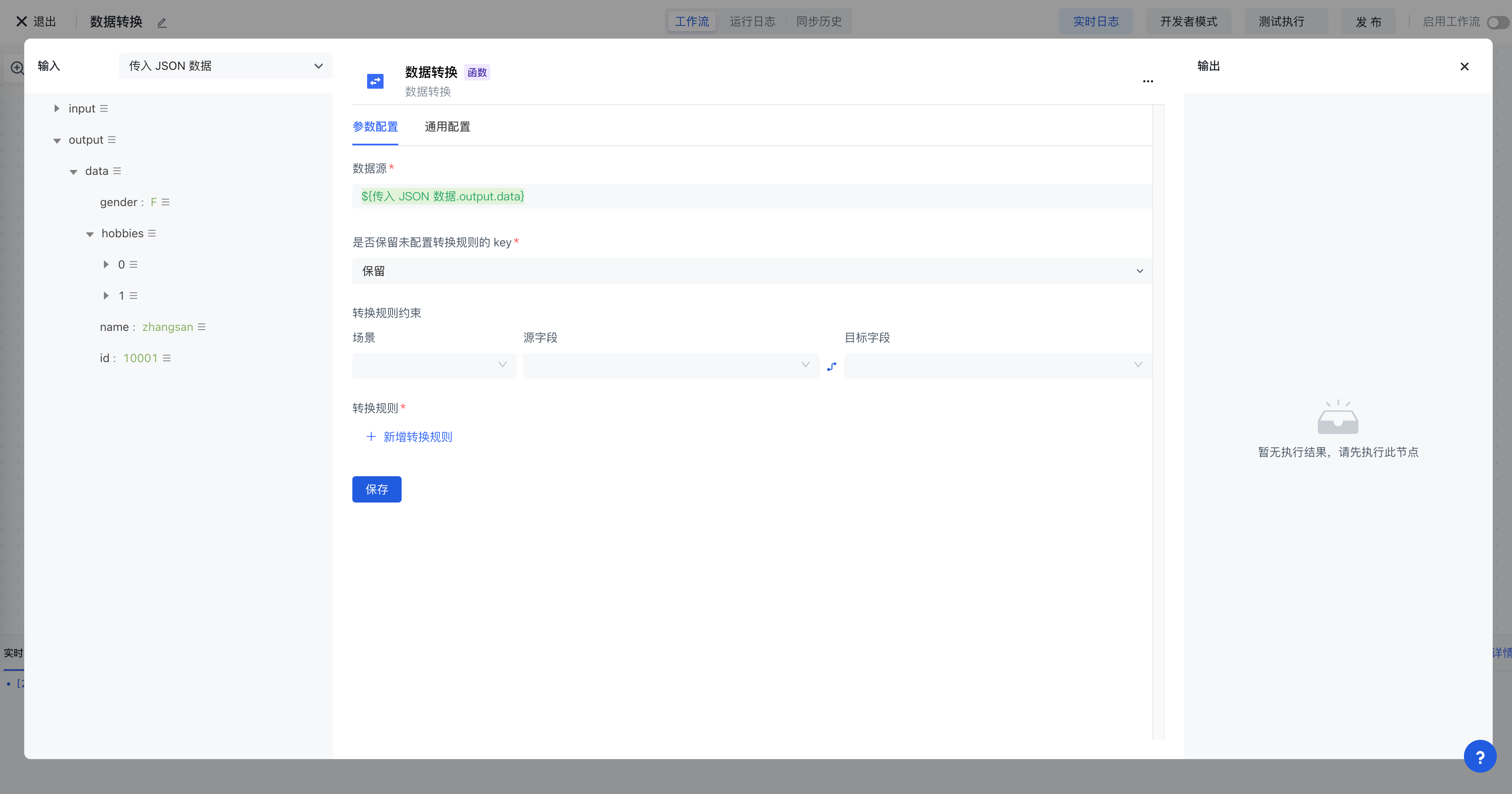 是否保留未配置的转换规则的 key:如果选择保留,未在下方配置转换规则的 key 也会被保留下来,作为输出参数流转到下一个节点;如果选择去除,则之后保留配置了转换规则的 key,其他 key 会被丢弃。