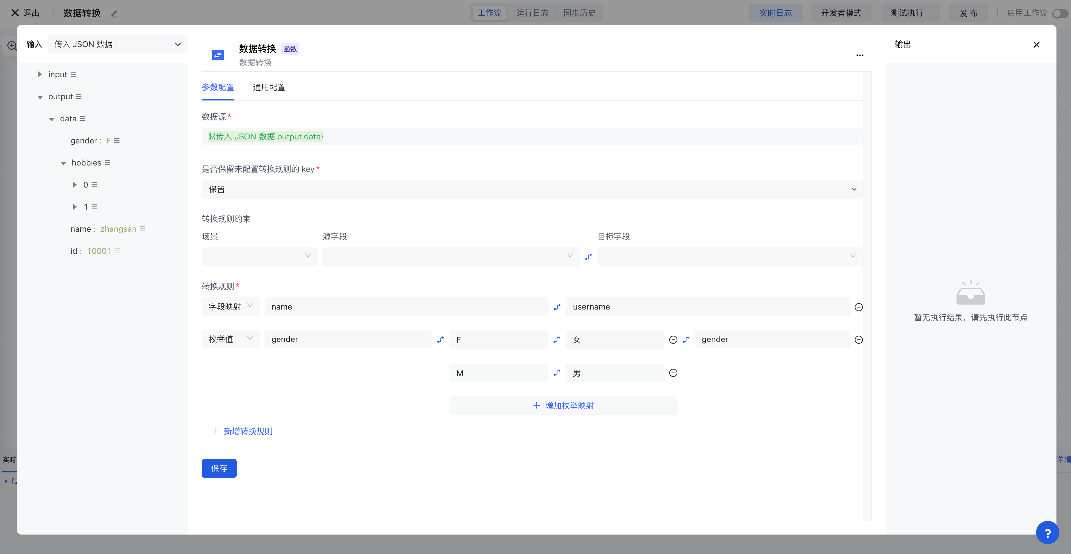 1. 添加数据转换节点,将 name 映射为 username,将 gender 映射为 从 “M/F” 映射为 “男/女” 。