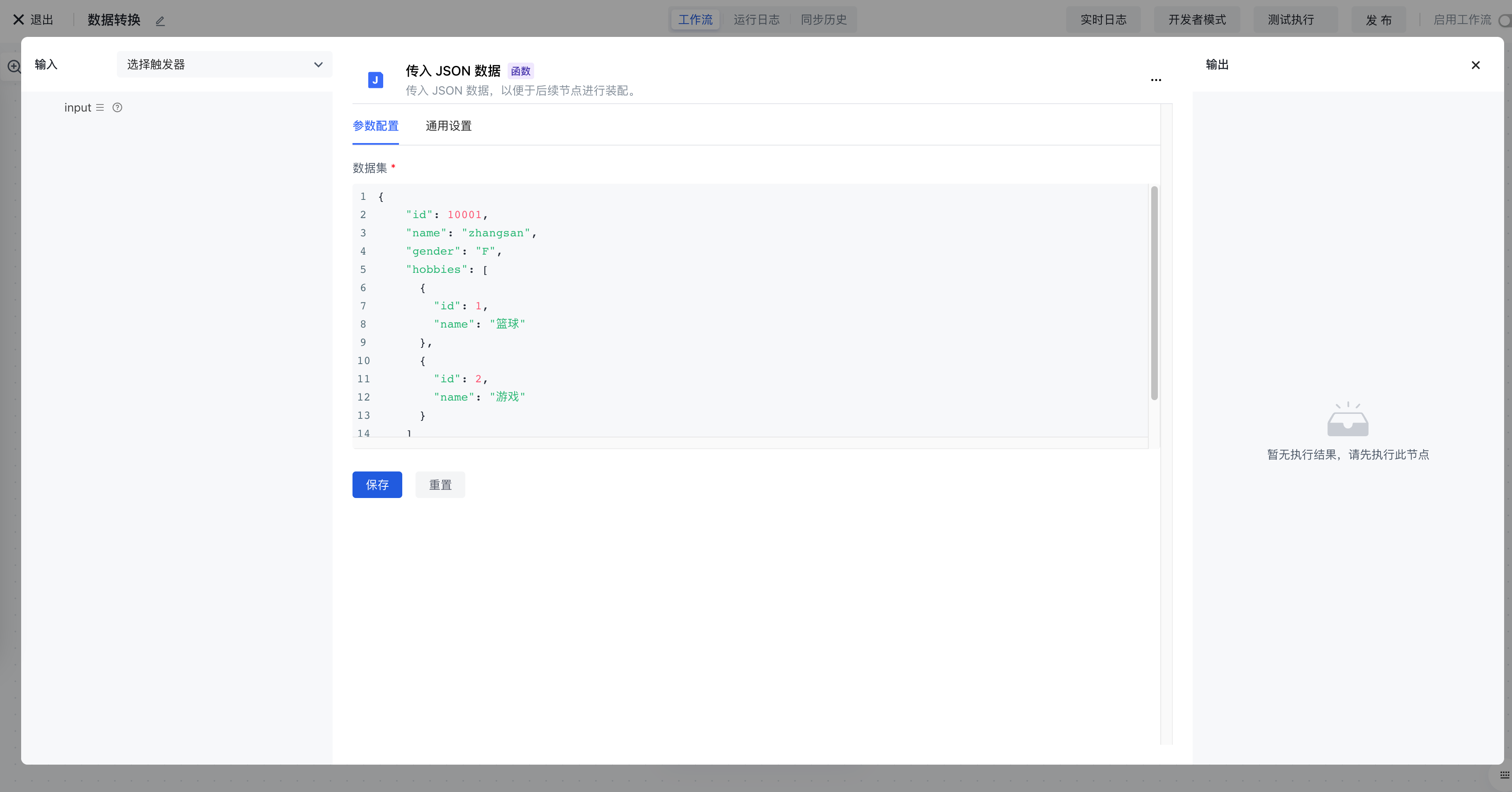 2. 先装配数据源,为上一个 「传入 JSON 数据」 节点的输出 output。