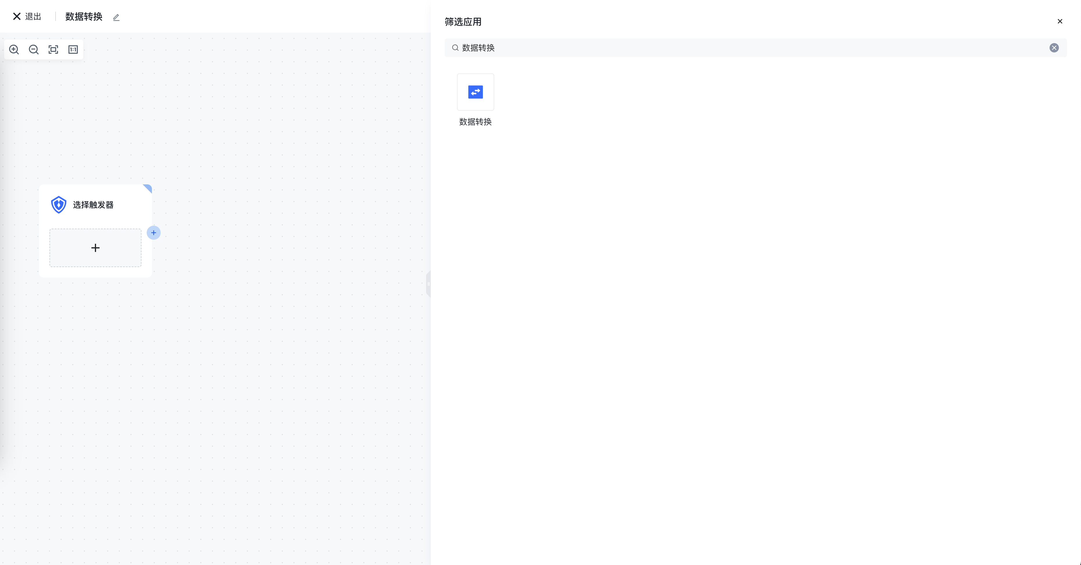 点击画布中的「执行器」,在「筛选应用」卡片上搜索「数据转换」,点击数据转换节点,即可在工作流的画布上添加数据转换节点。