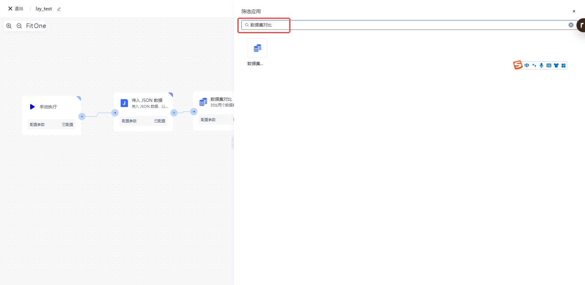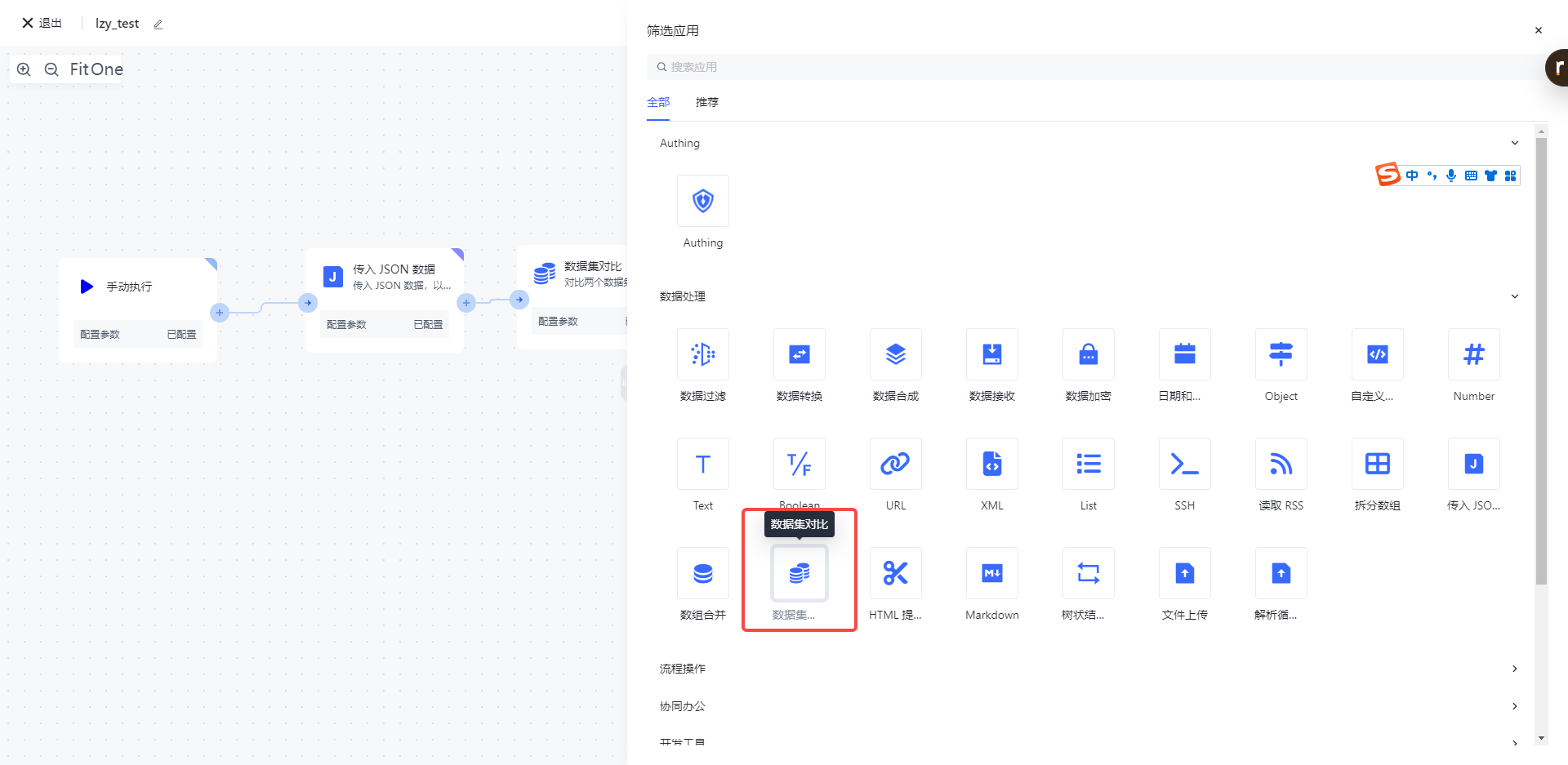在添加节点页面,在「数据处理」分类中找到「数据集对比」应用节点。