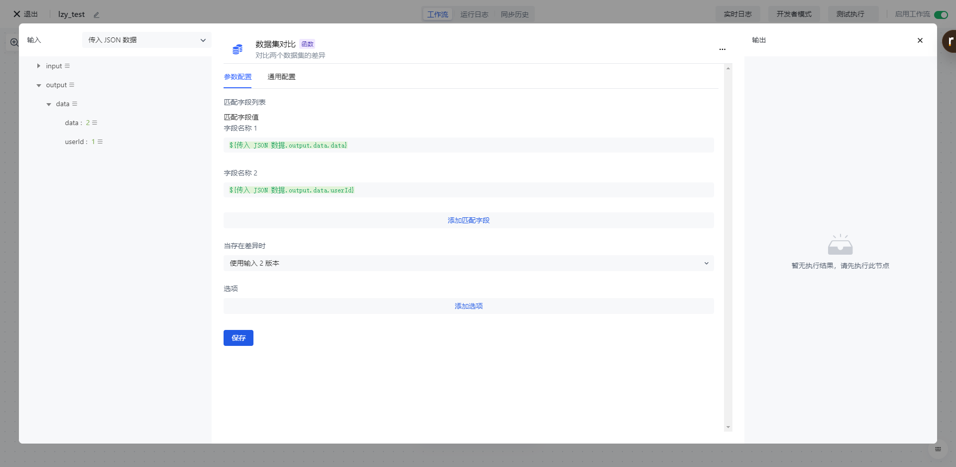 • 匹配字段列表,填入待对比字段 1, 2 。