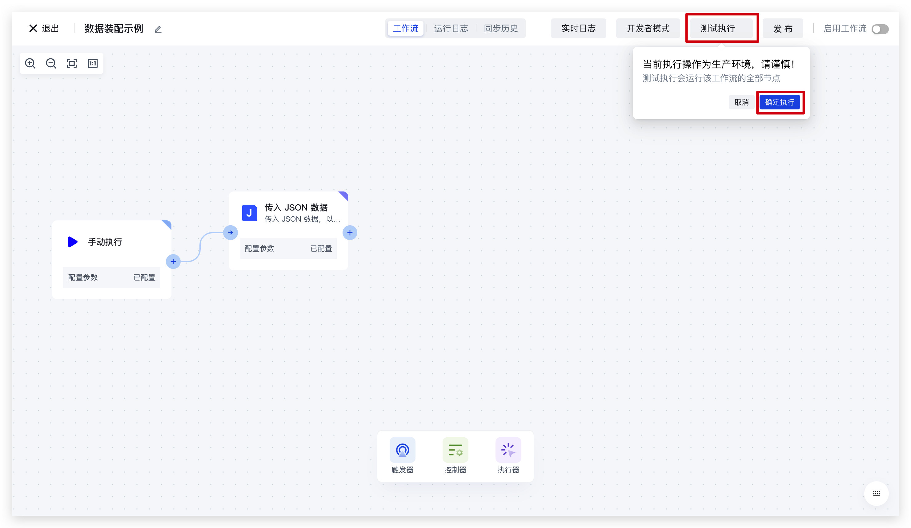 3)先点击 测试执行中的确定执行,让 workflow 先执行