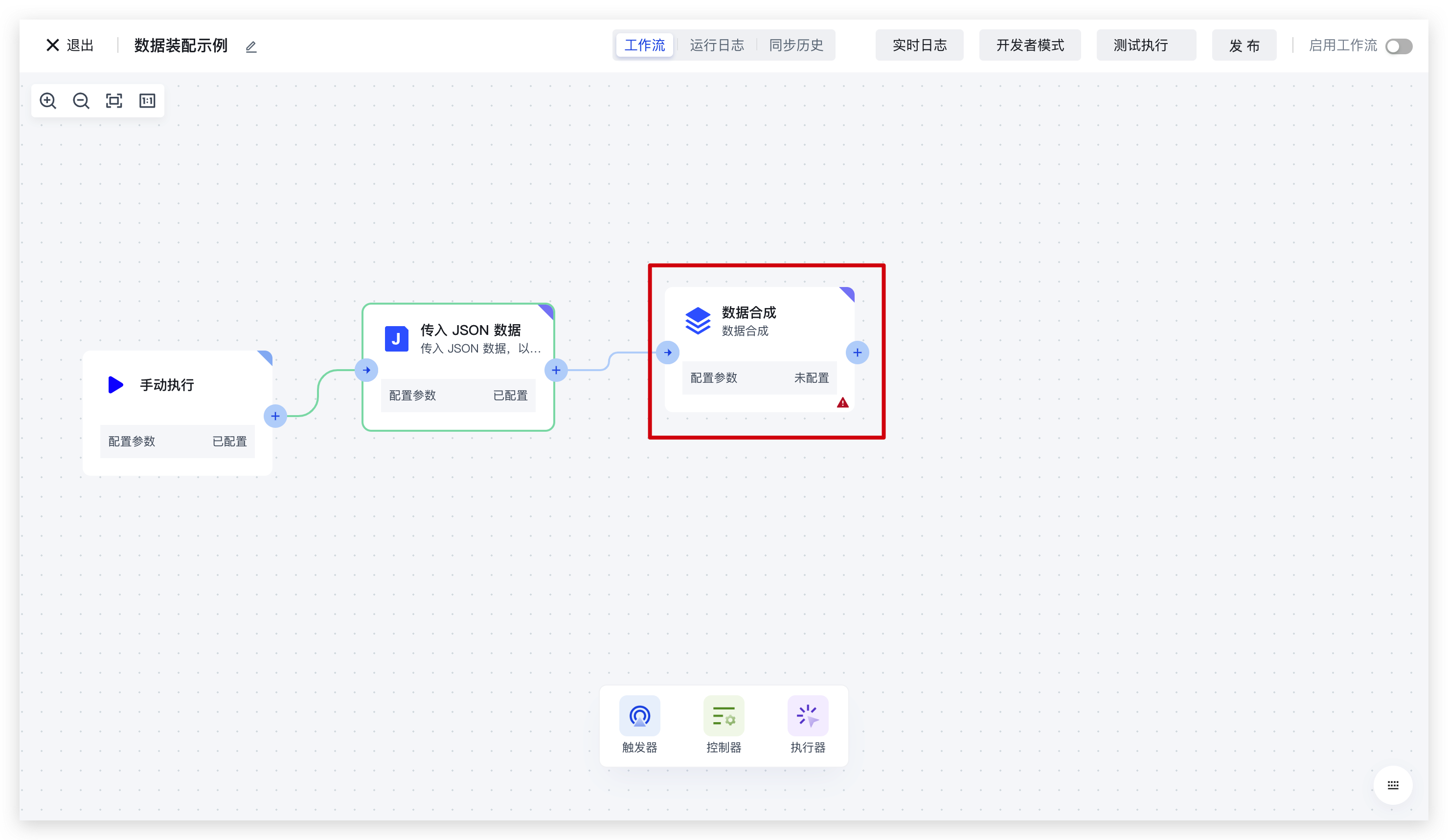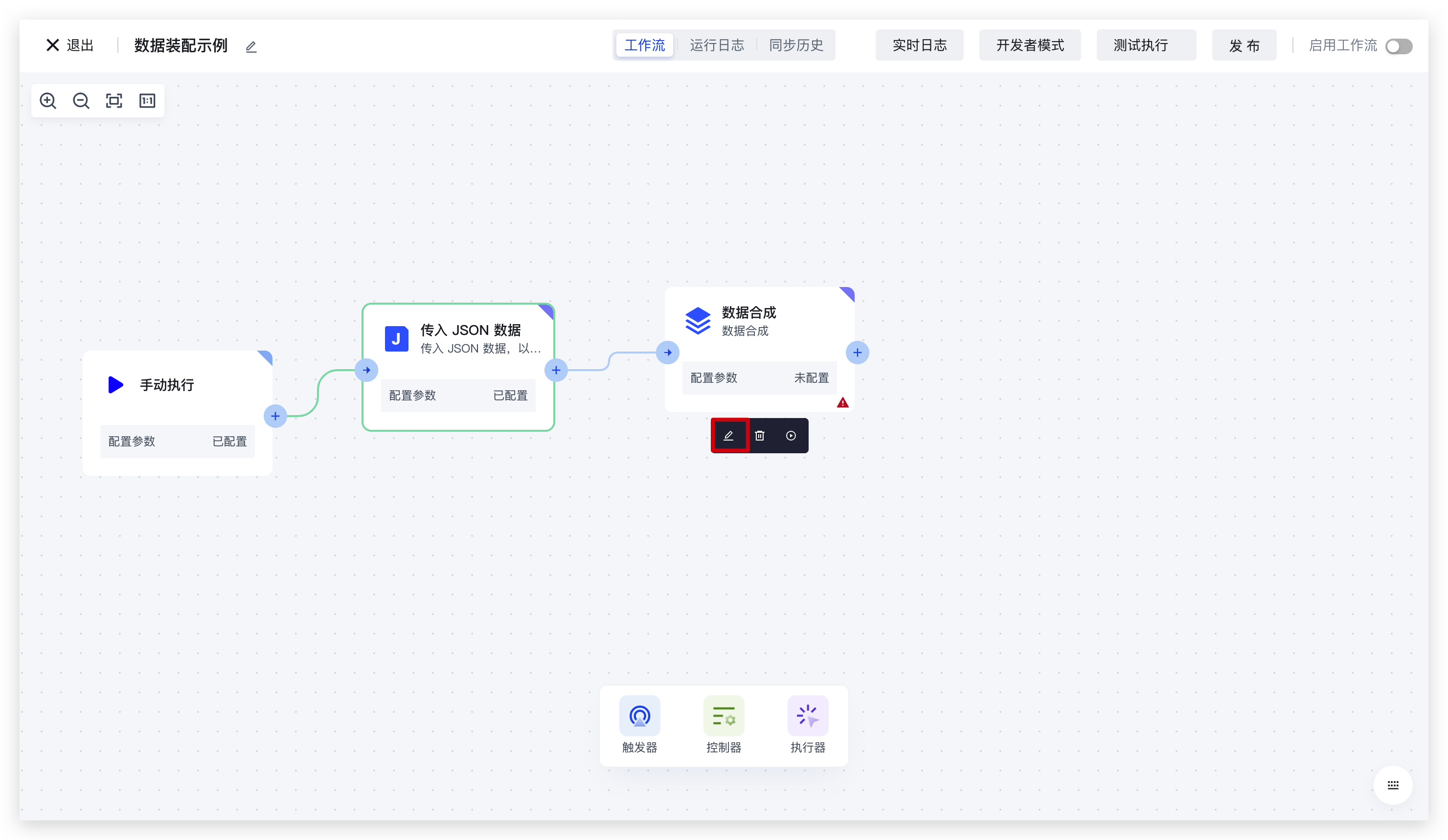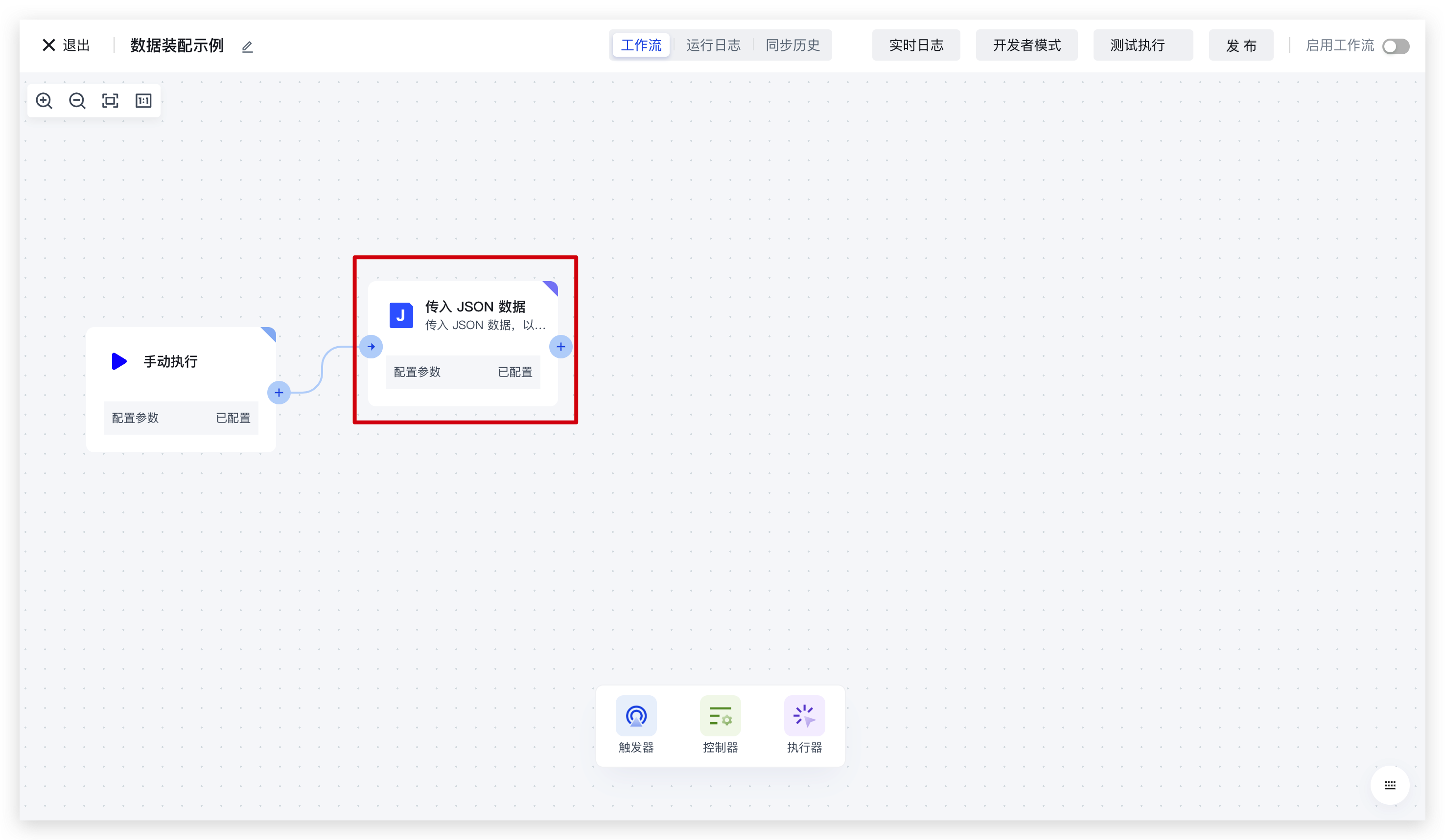 在此我们创建一个简单的 workflow:使用 JSON 节点拉取数据,再使用数据合成节点测试数据装配的使用:
