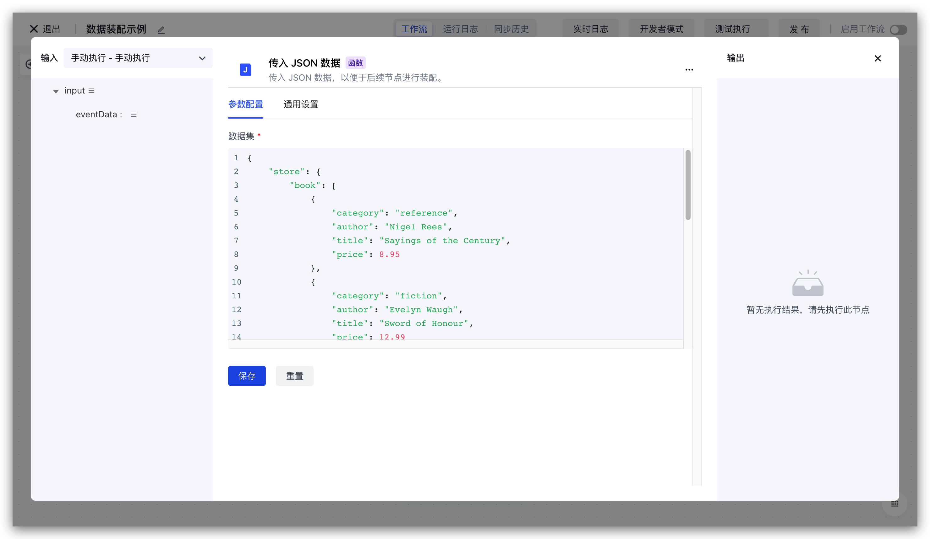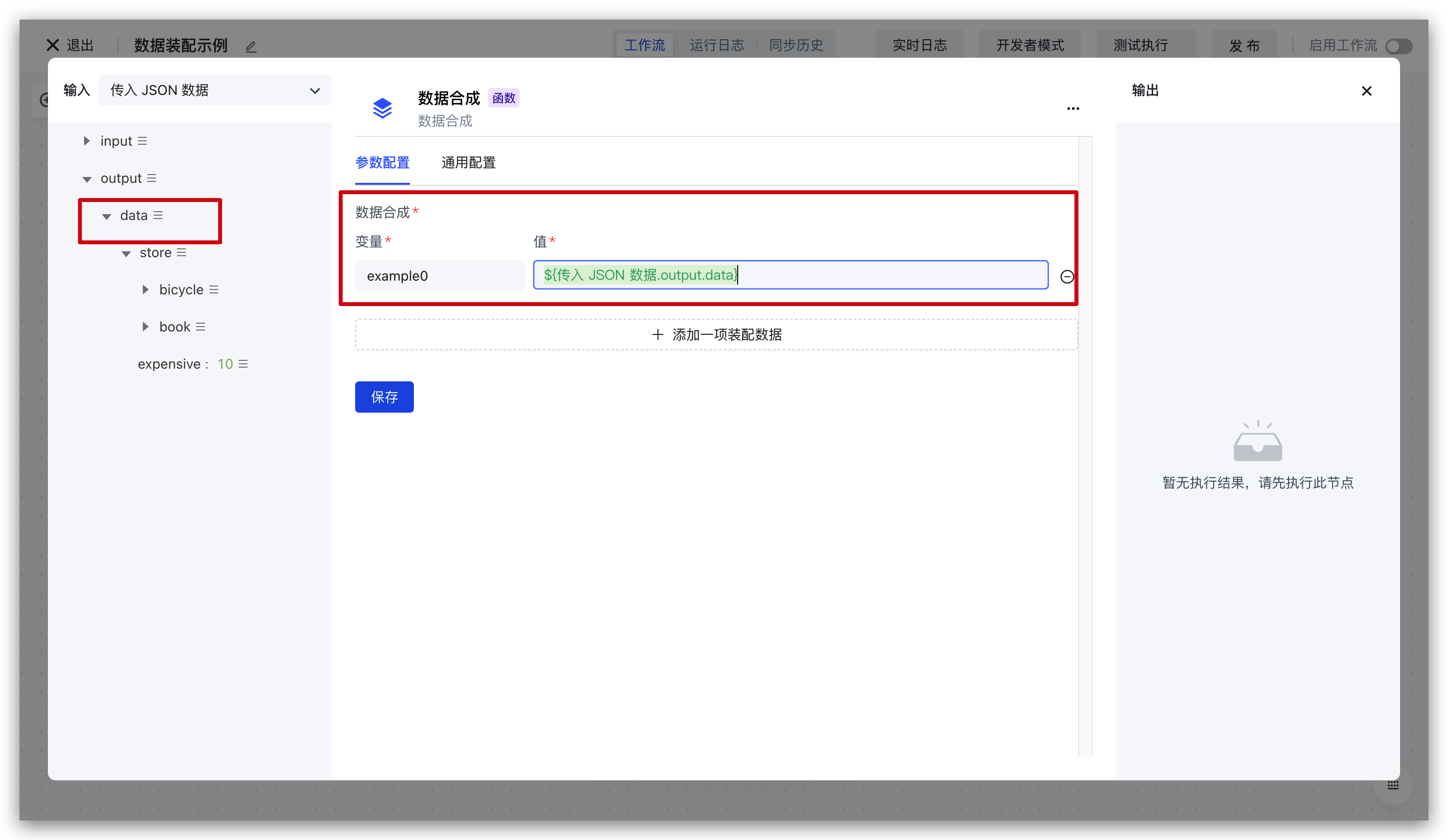 执行 workflow,你就可以看到数据合成节点的输出,即我们测试的装配结果:比如最简单的场景,就是直接对值的引用。下面会介绍其他更高级的数据装配表达式。