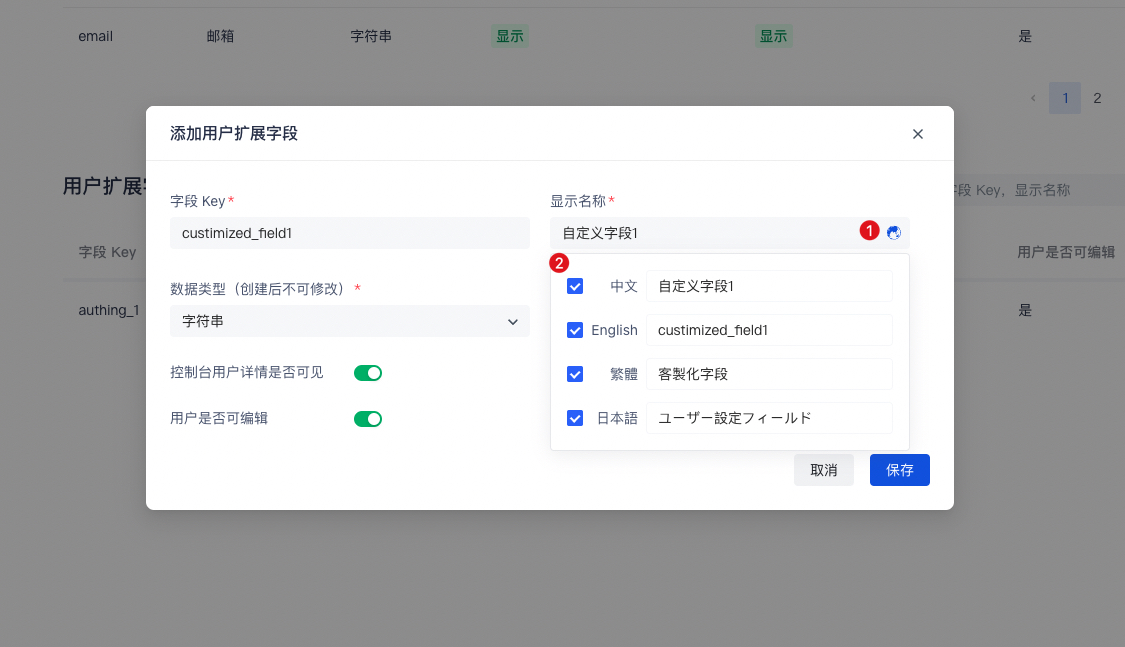 - 勾选「中文」,并编辑中文环境下的字段显示名称