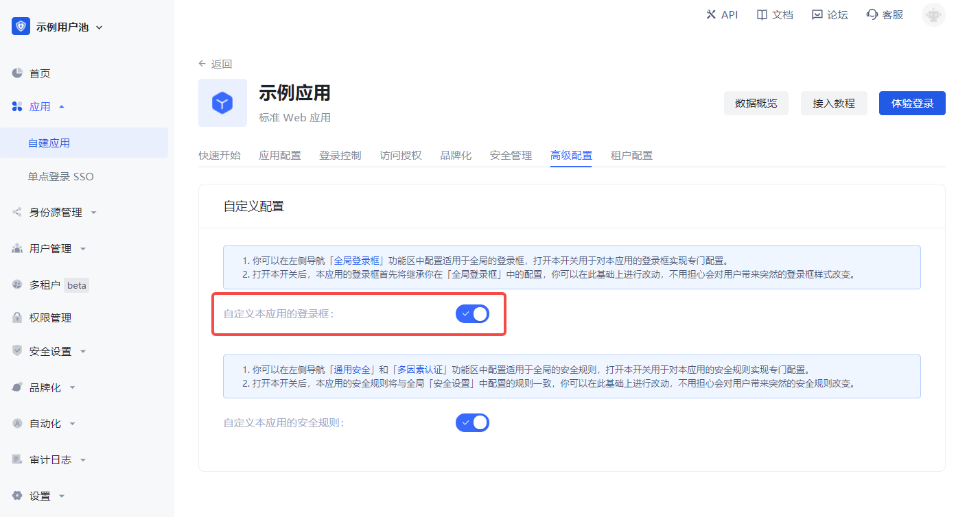 在 应用详情 - 高级配置 页,开启 自定义本应用的登录框
