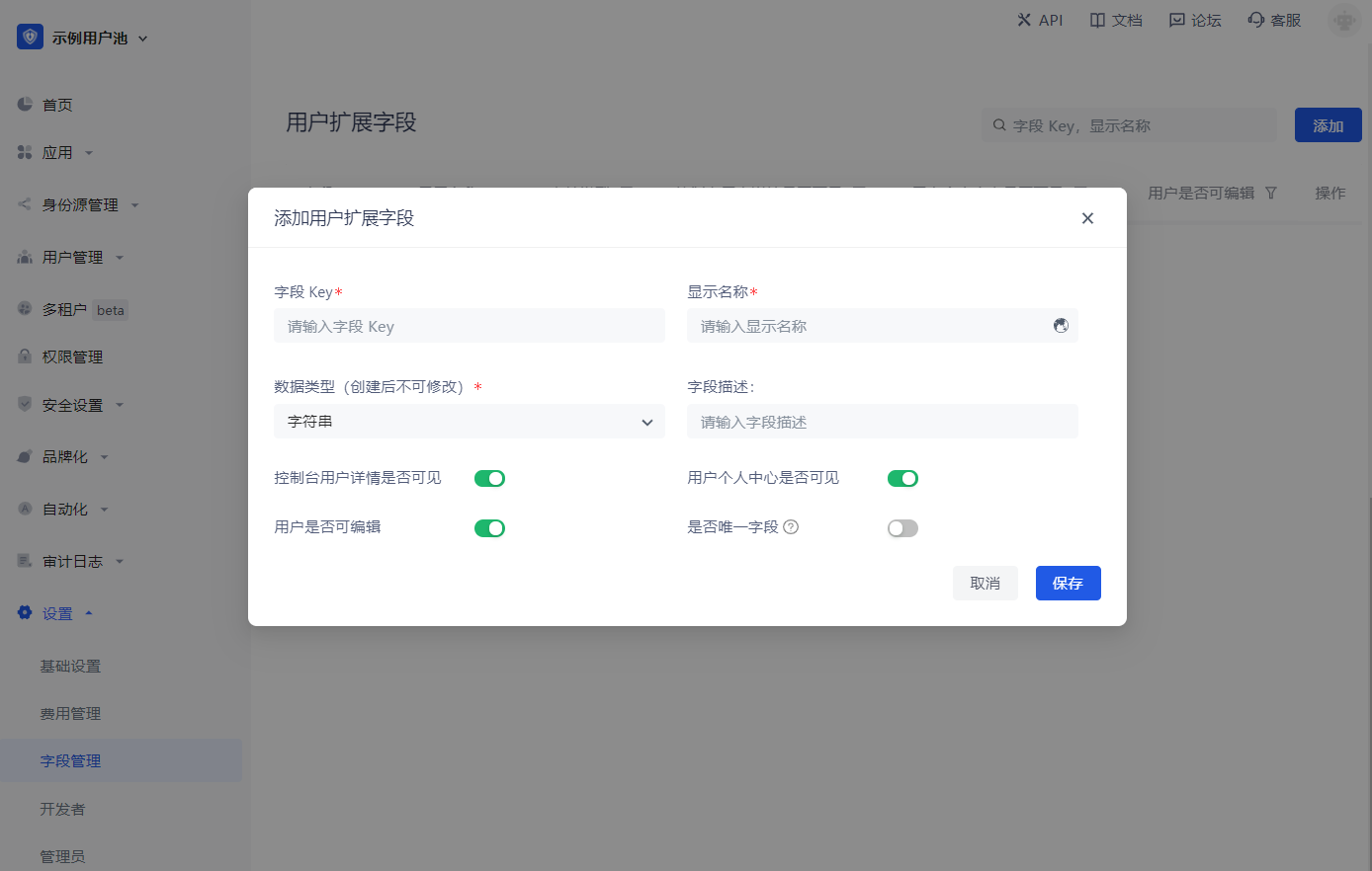用户自定义字段是除了基础用户字段之外,可以给用户对象添加的额外字段。开发者可以通过设置自定义字段,存储少量业务相关的数据。
