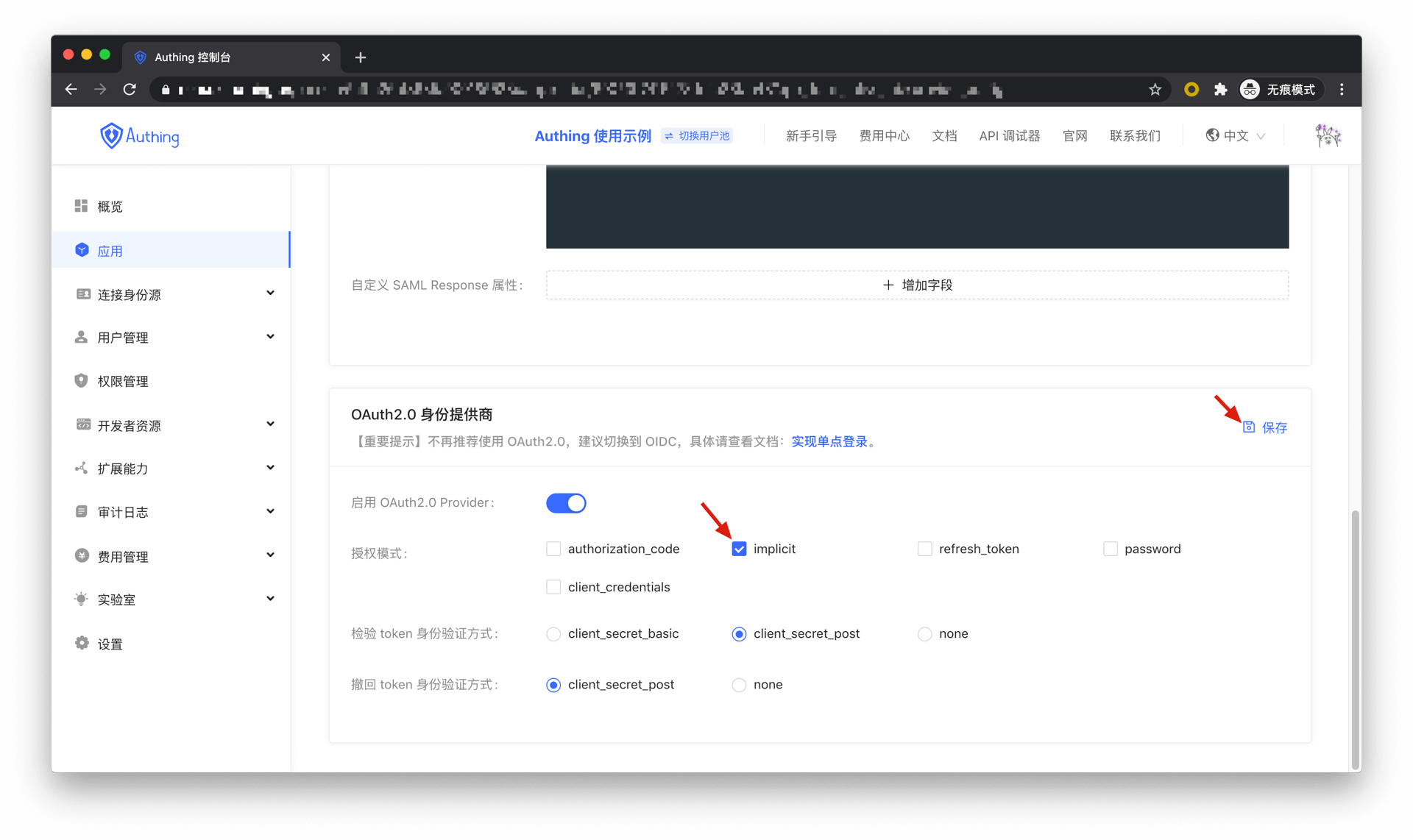 首先在控制台 > 应用,找到你的应用,进入应用详情,进入「启用身份提供商」选项卡,在下方的「OAuth2.0 身份提供商」卡片中,授权模式勾选 implicit,然后点击保存。