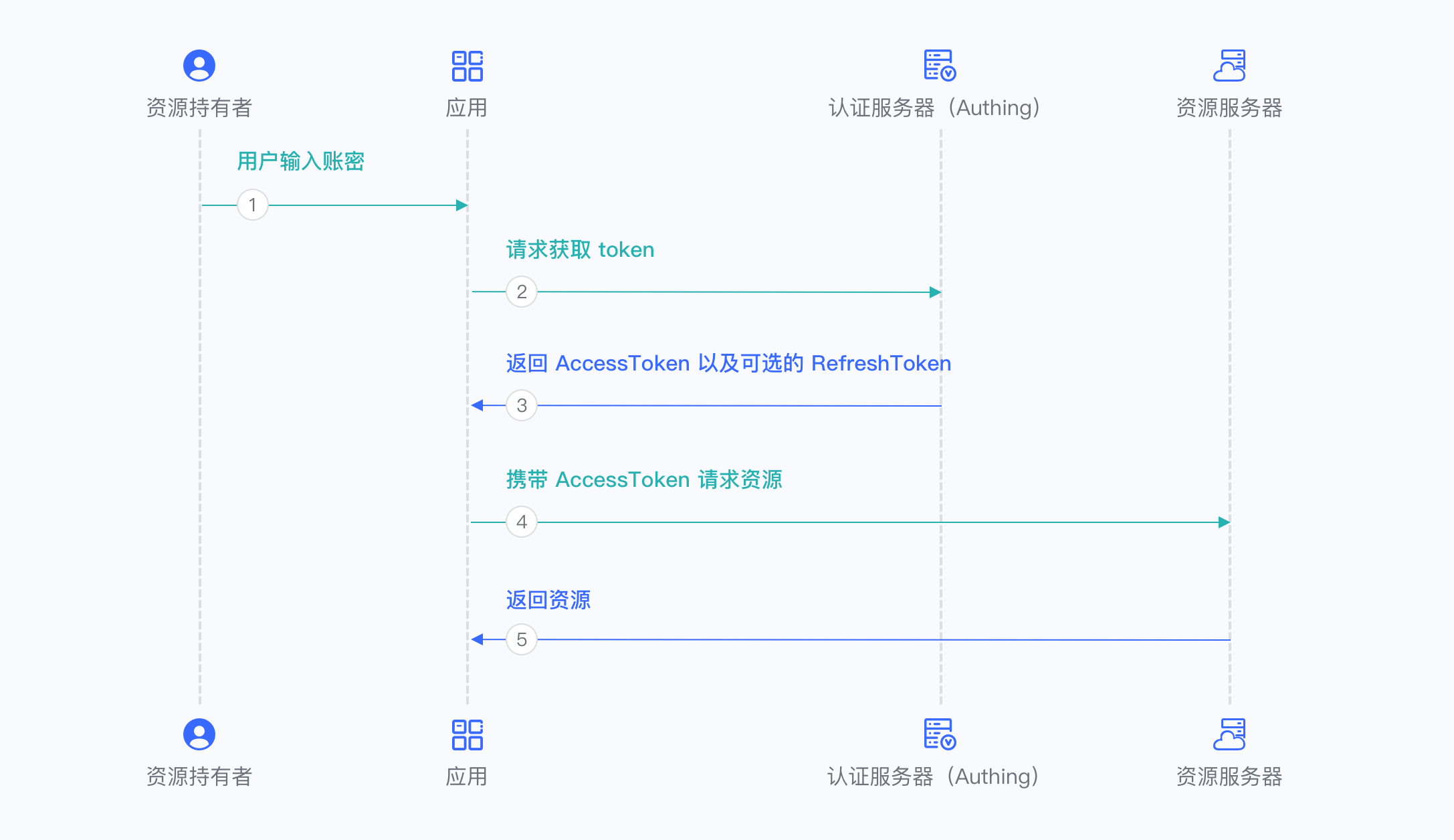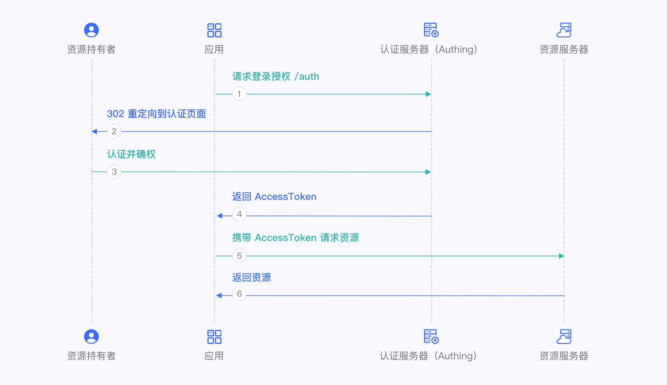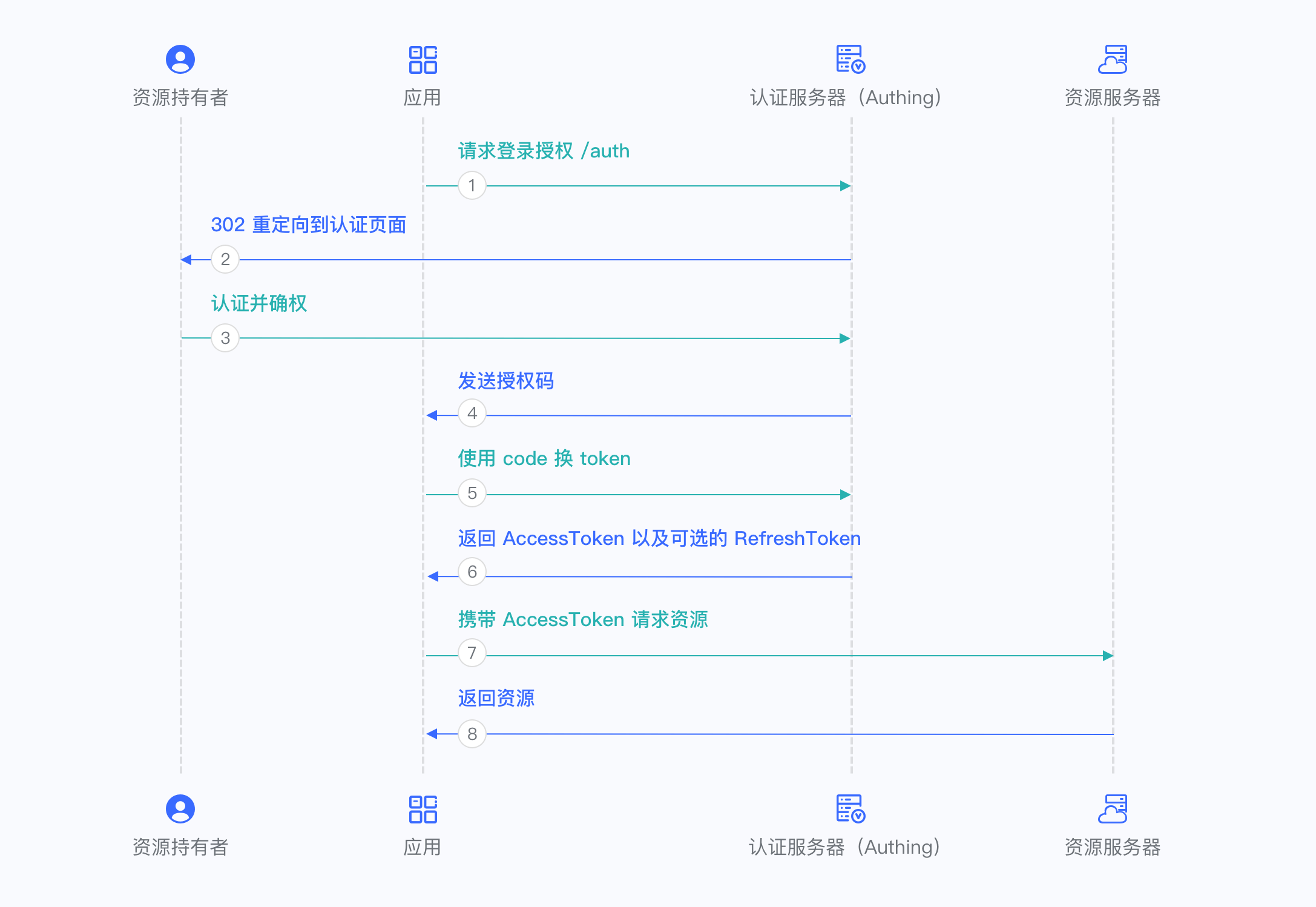 - 你的应用服务将授权码发送到 Authing 获取 AccessToken,如果需要,还会返回 refresh token。