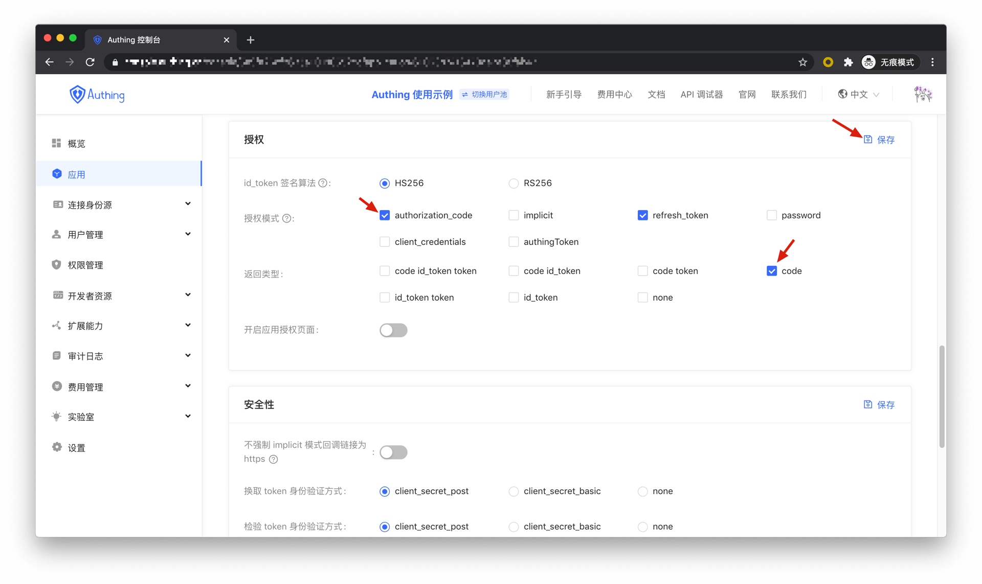 首先在控制台 > 应用,找到你的应用,进入应用详情,在下方的「授权」卡片中,授权模式中勾选 authorization_code,返回类型中勾选 code,然后点击保存。