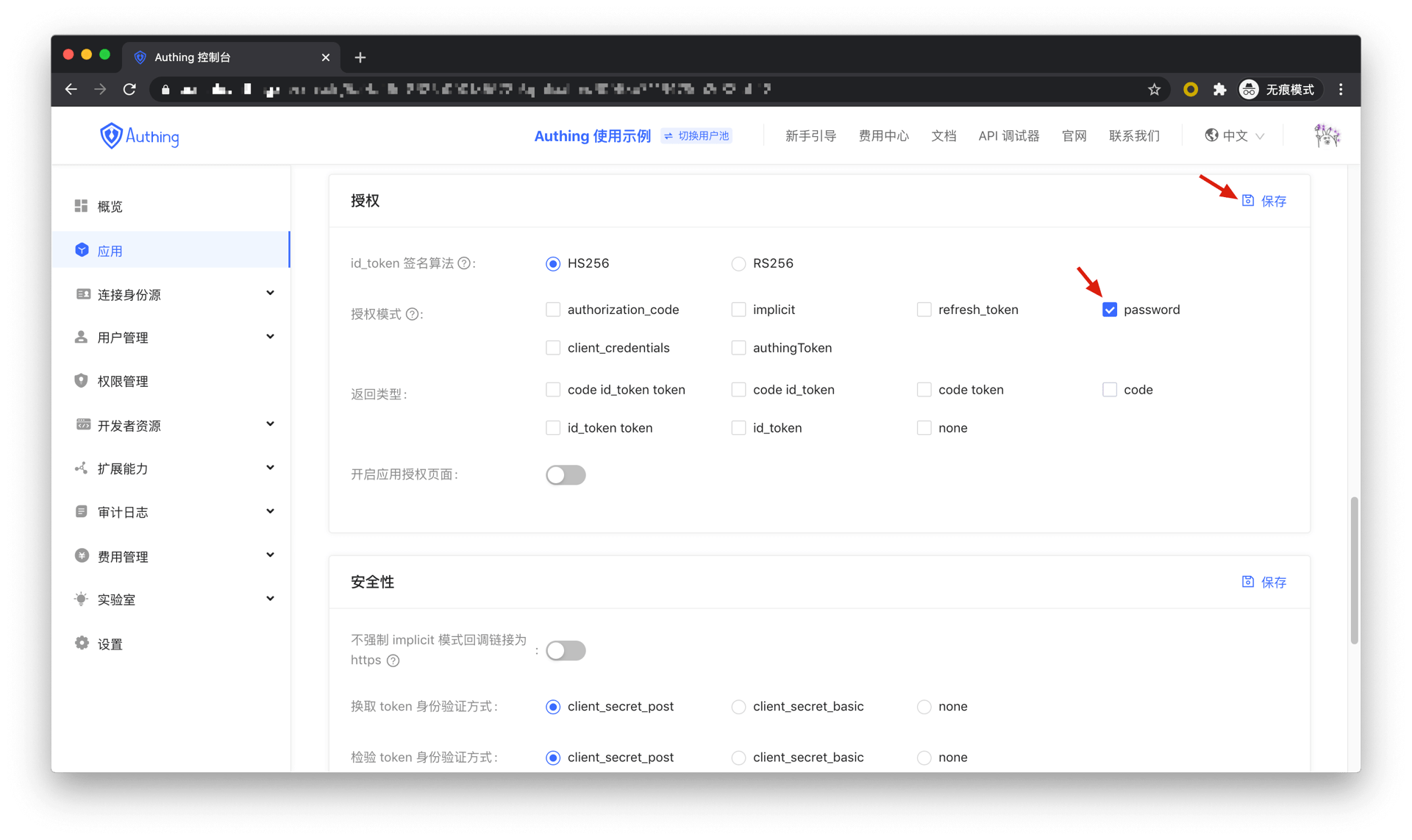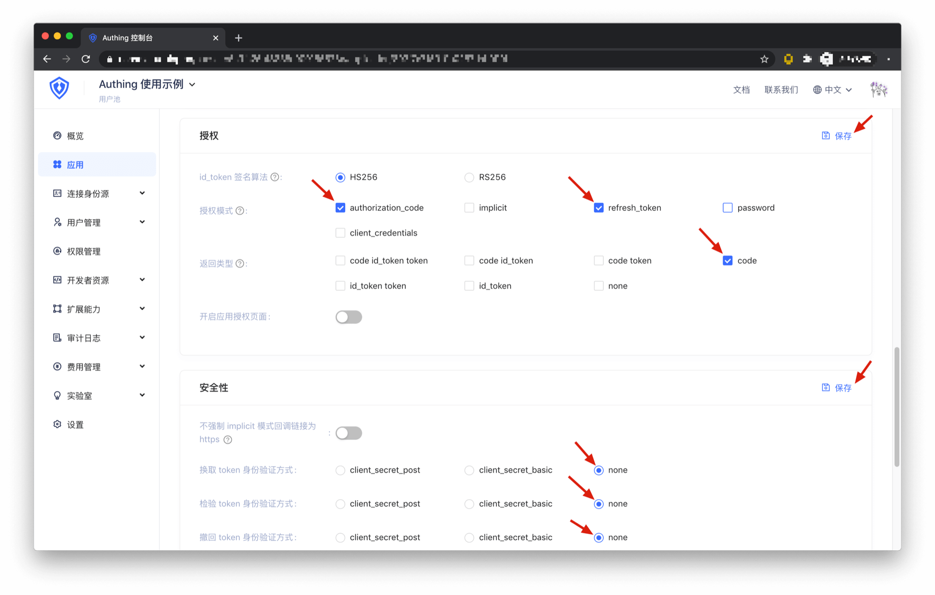 首先在控制台 > 应用,找到你的应用,进入应用详情,在下方的「授权」卡片中,授权模式中勾选 authorization_code,返回类型中勾选 code,点击保存。在「安全性」卡片中,换取 token 身份验证方式、检验 token 身份验证方式、撤回 token 身份验证方式选择 none 然后点击保存。
