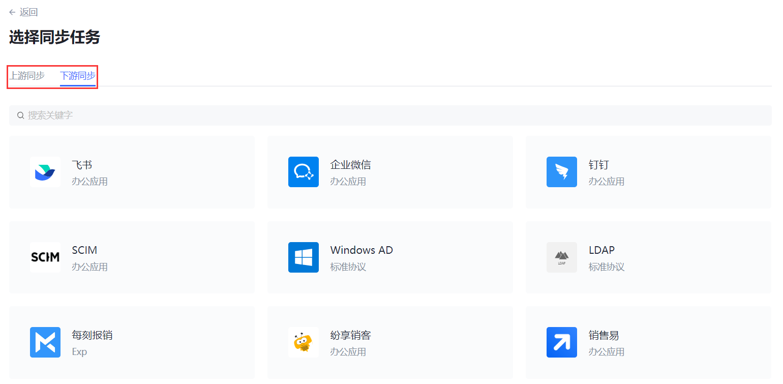 - 在 选择同步任务 窗口根据需要切换 上游同步 / 下游同步 选项卡,选择进入一个上 / 下游应用。