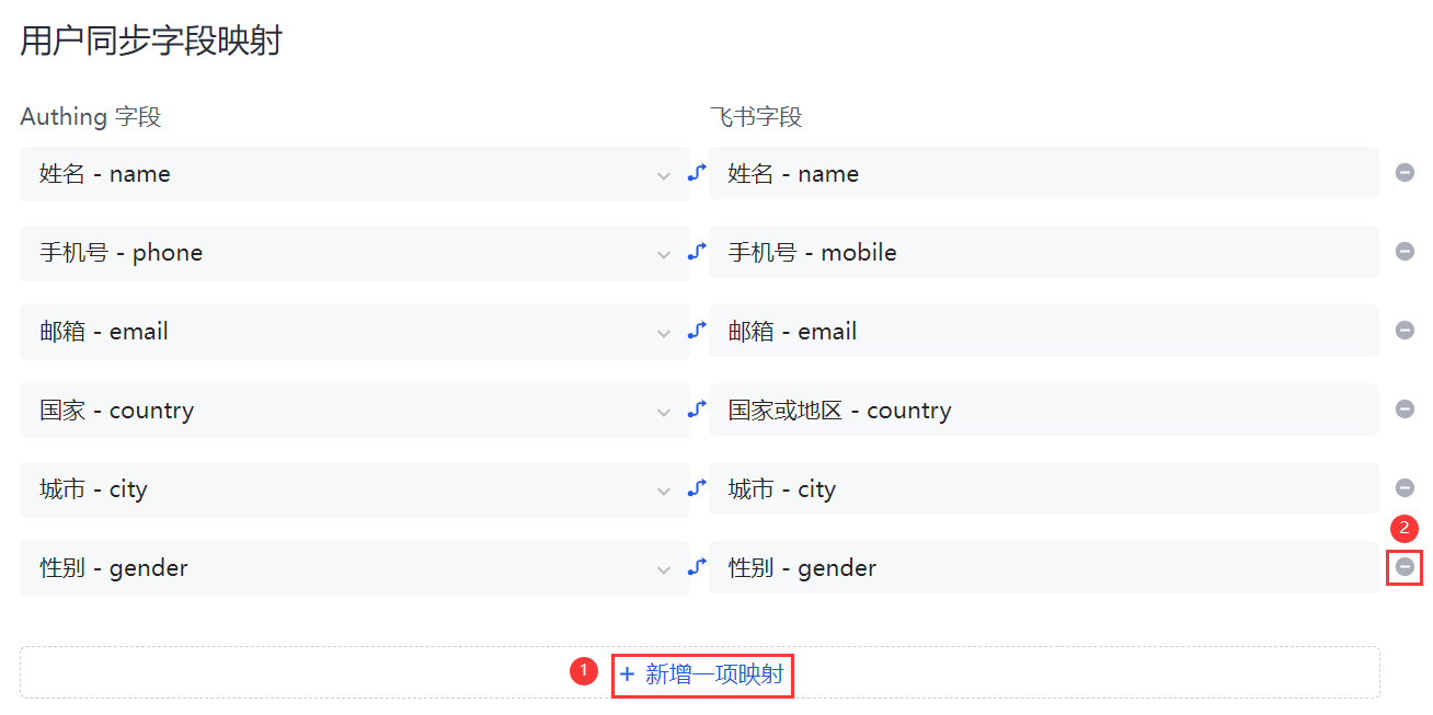 自定义字段映射用于用户自主选择需要同步的数据。支持用户在此模块增加及删除字段映射。