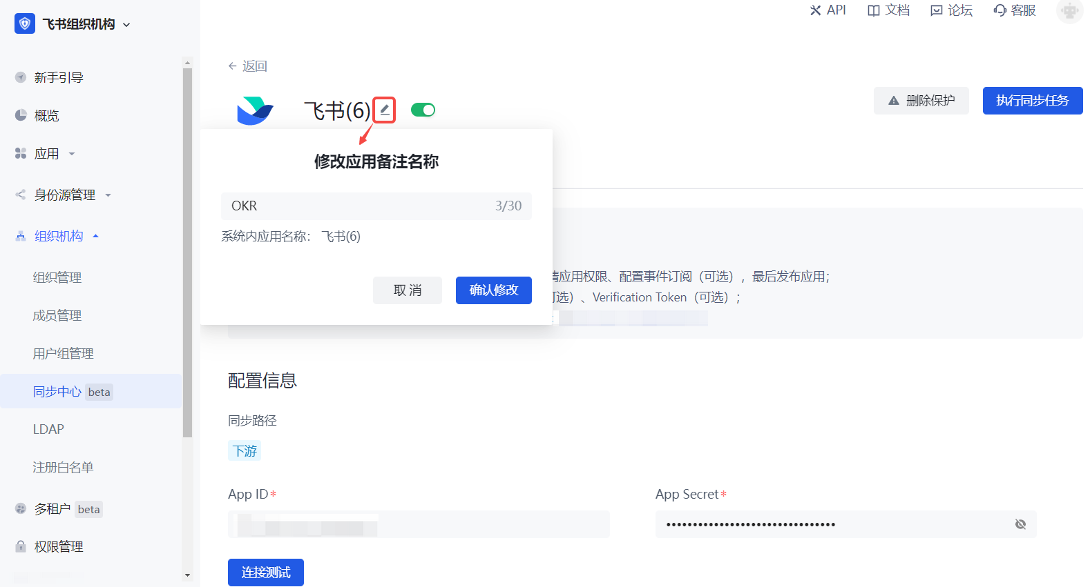 除了可以修改 配置信息、同步范围、用户同步字段映射、同步信息,管理员还可以修改同步任务备注名称,赋予其具有实际业务意义的命名。从而在同步任务画布包含诸多任务时,便于区分。
