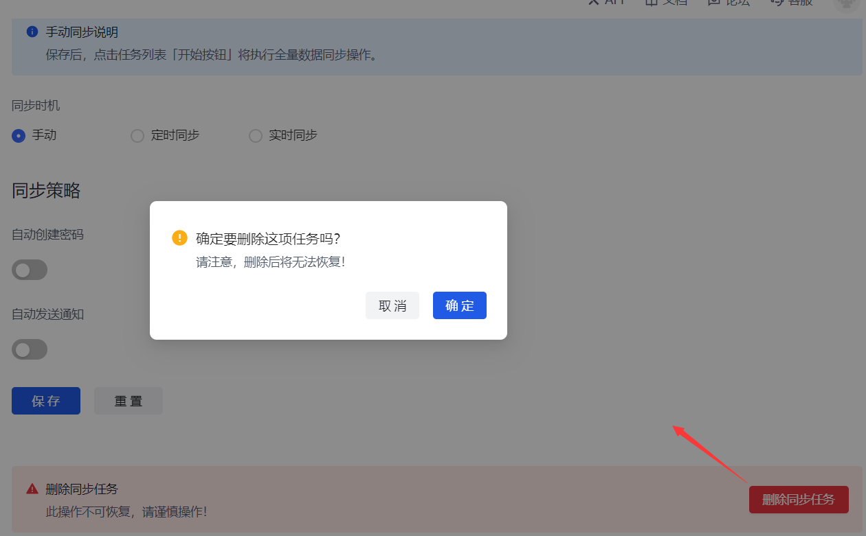 - 对于存在删除操作的同步任务,管理员可以 处理删除保护。
