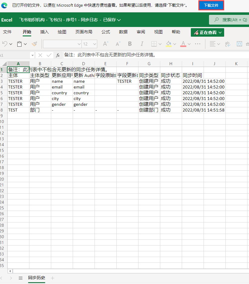 打开 Excel 格式同步日志。点击 下载文件 将同步日志下载到本地。