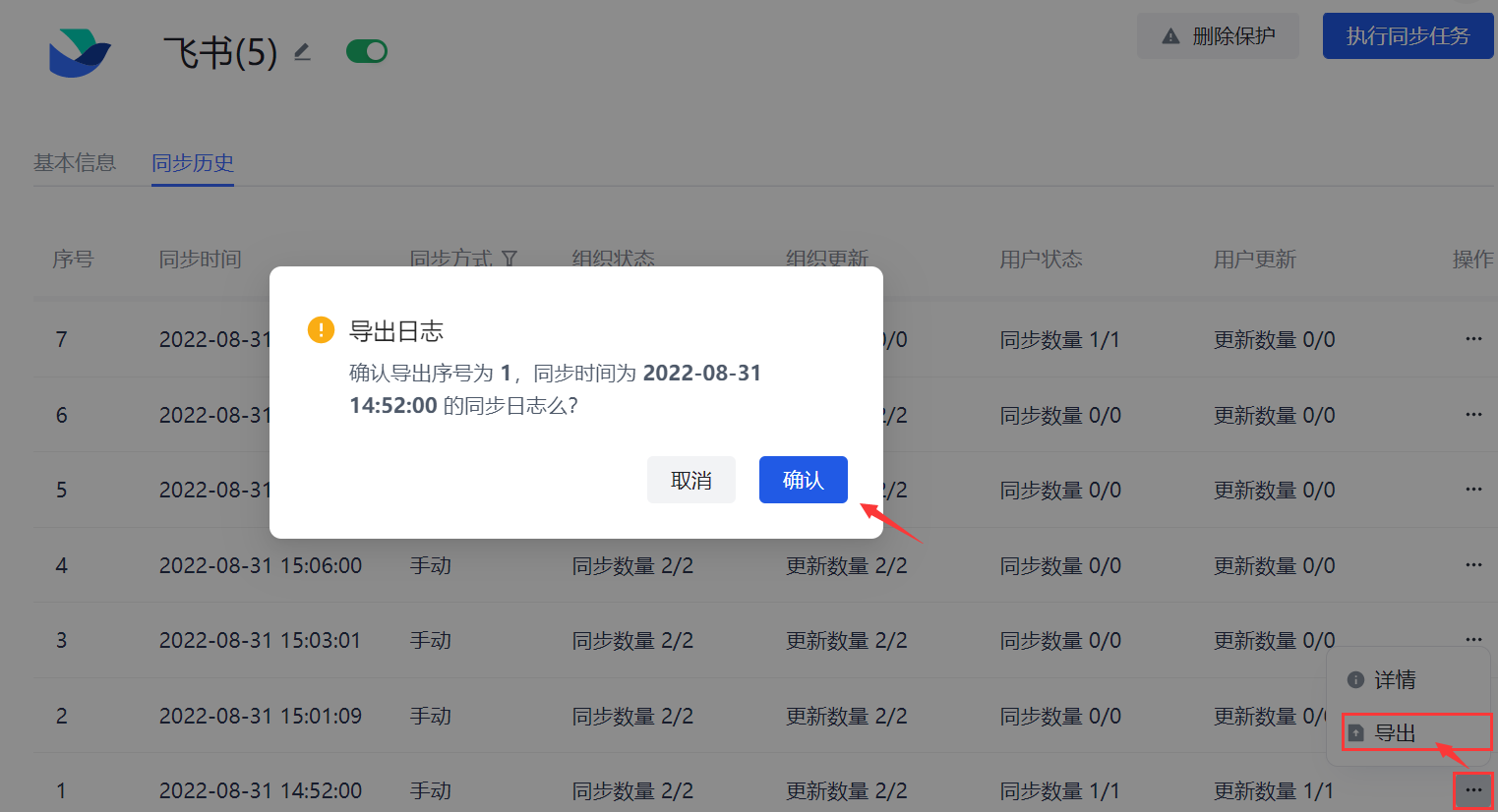 - 在 同步历史 标签页,点击执行列表中某次执行所在行 操作 列 导出 按钮。