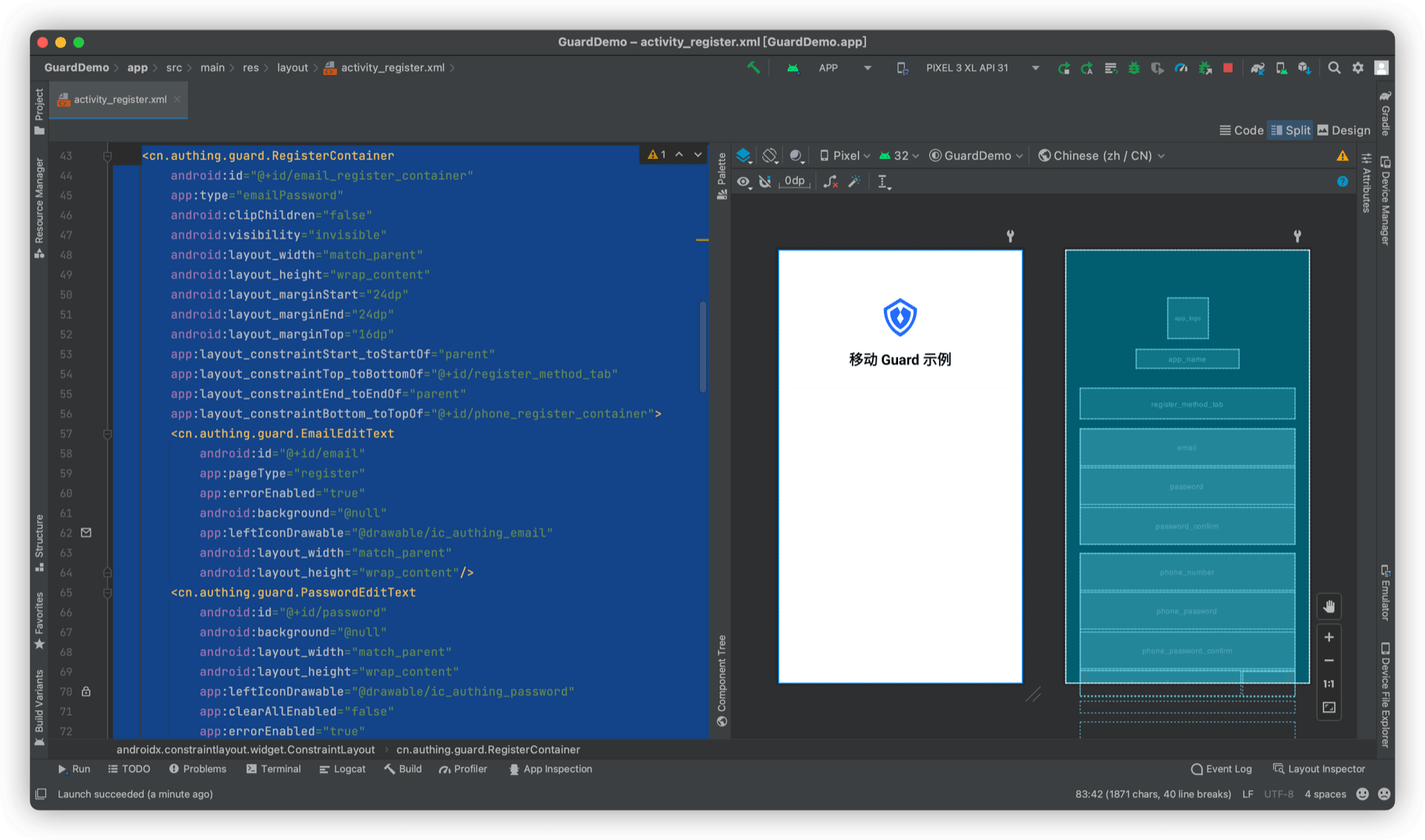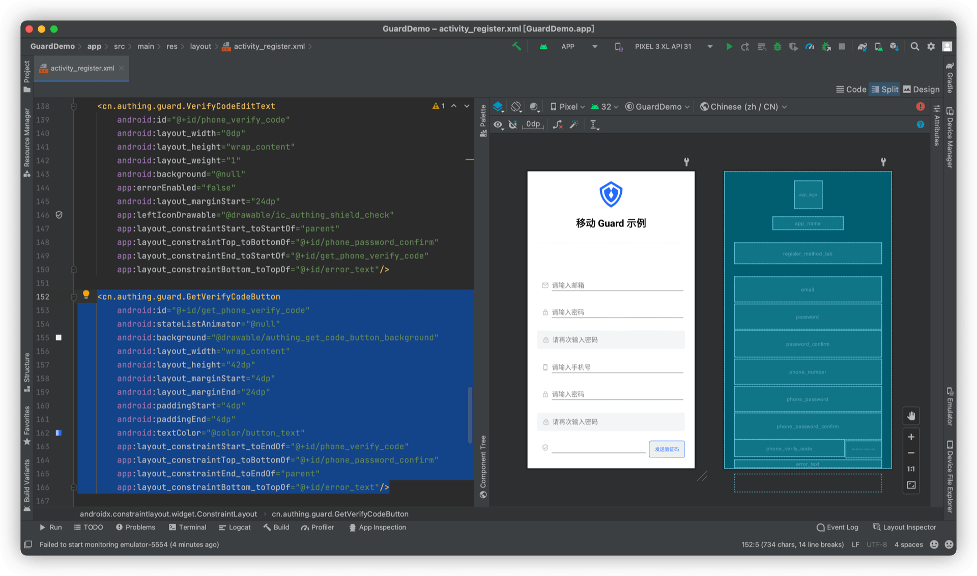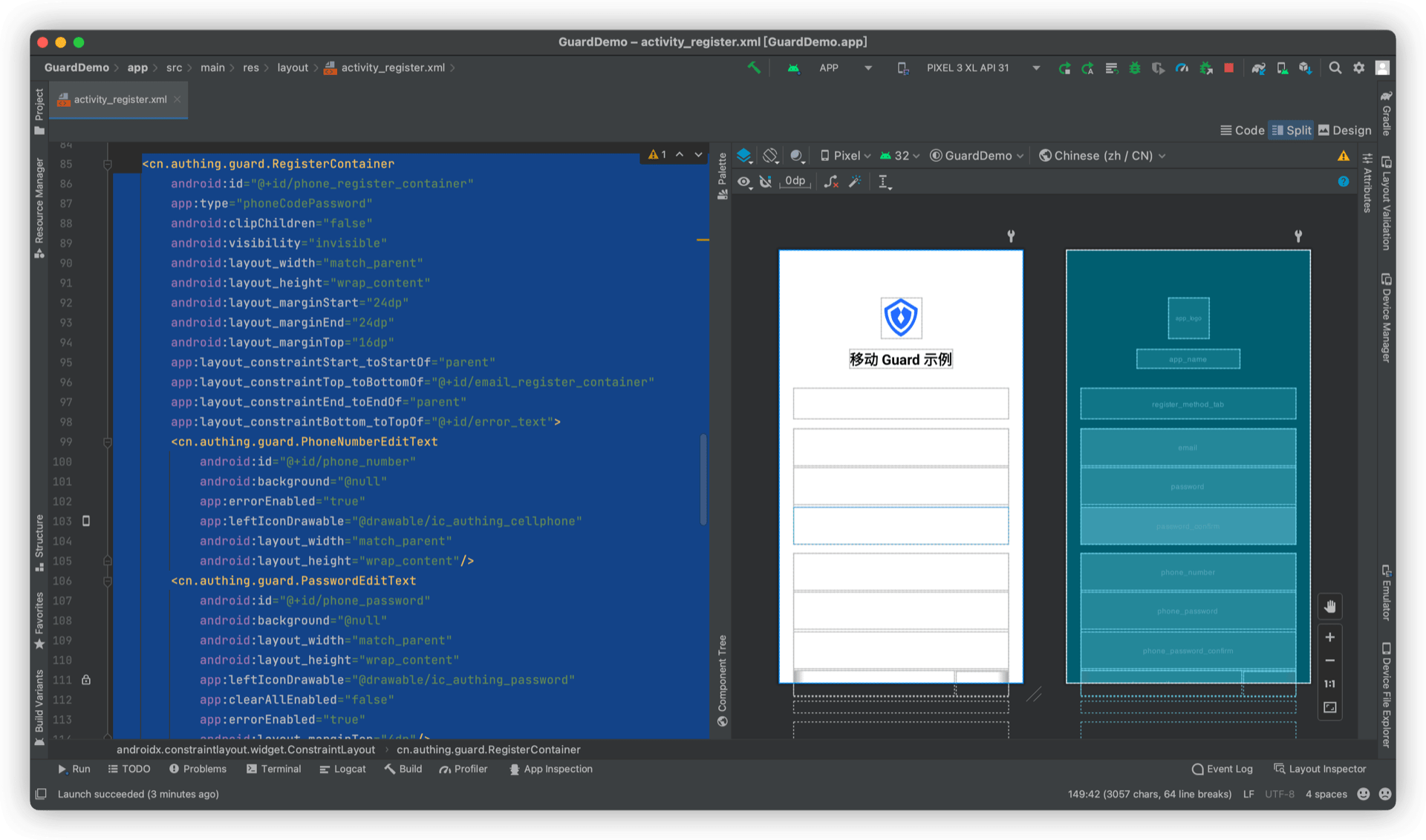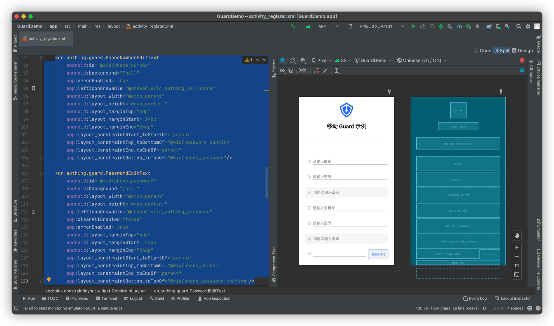 再放置一个 RegisterContainer,将 PhoneNumberEditText、PasswordEditText、PasswordConfirmEditText、VerifyCodeEditText、GetVerifyCodeButton 放到里面,设置 type 属性 app:type="phoneCodePassword"。