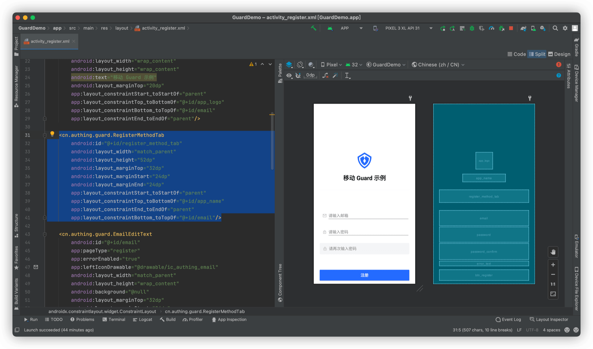 放置一个 RegisterContainer,将 EmailEditText 、 PasswordEditText 和 PasswordConfirmEditText 放到里面,设置 type 属性 app:type="emailPassword"。